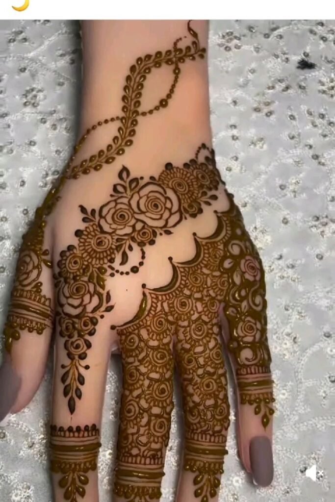Arabic aesthetic mehndi designs are known for their bold yet elegant beauty. These designs often feature large floral patterns, vines, and shaded details that create a royal look. The designs usually flow diagonally across the hand or arm, leaving some skin space, which gives a neat and modern effect. Arabic mehndi fits beautifully for weddings, Eid, and festive events, balancing tradition with style.