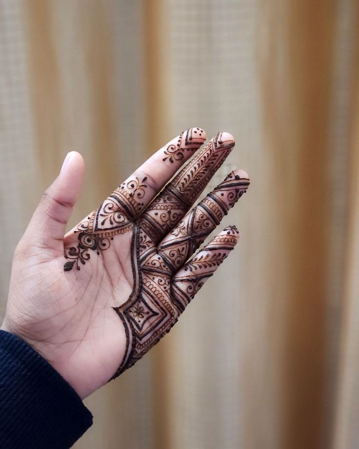 Line art mehndi designs use straight and curved lines to form unique patterns. These designs are trendy, modern, and give a very aesthetic appearance on the front hand.