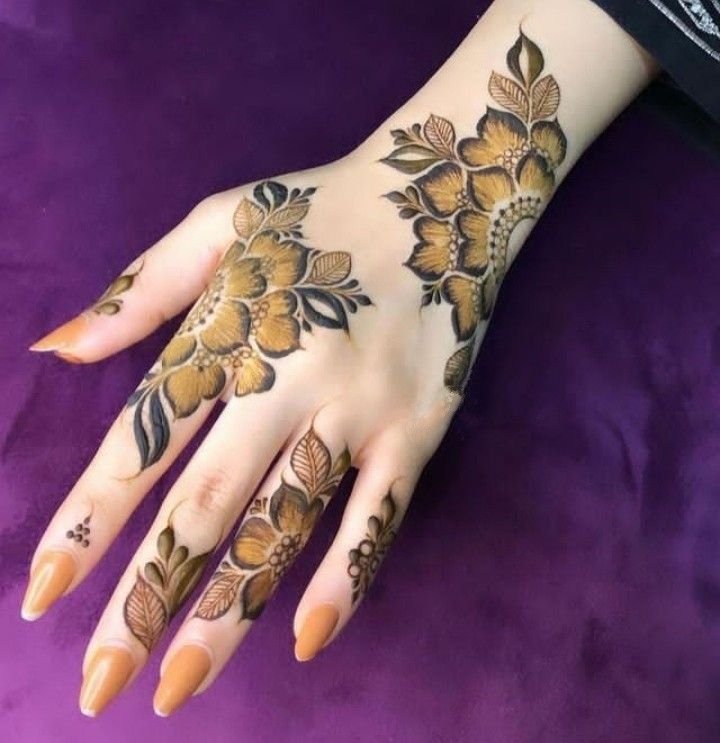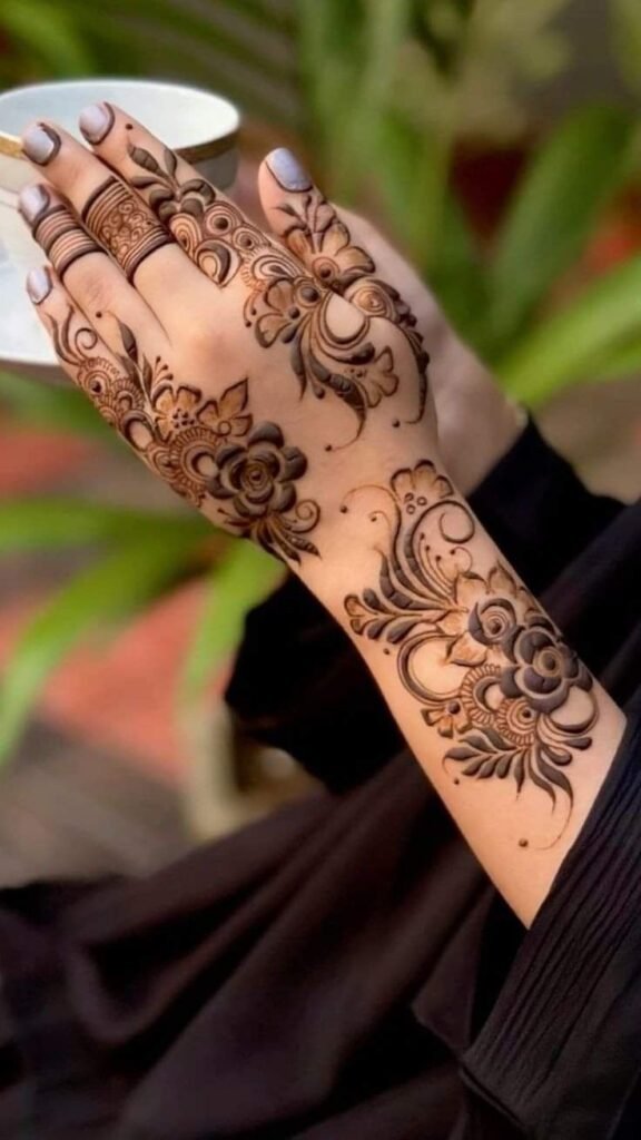 Arabic back hand mehndi design are known for their elegant look, bold outlines, and floral patterns. These designs are very popular among girls and women for Eid, weddings, and special occasions because they look stylish without being too heavy.