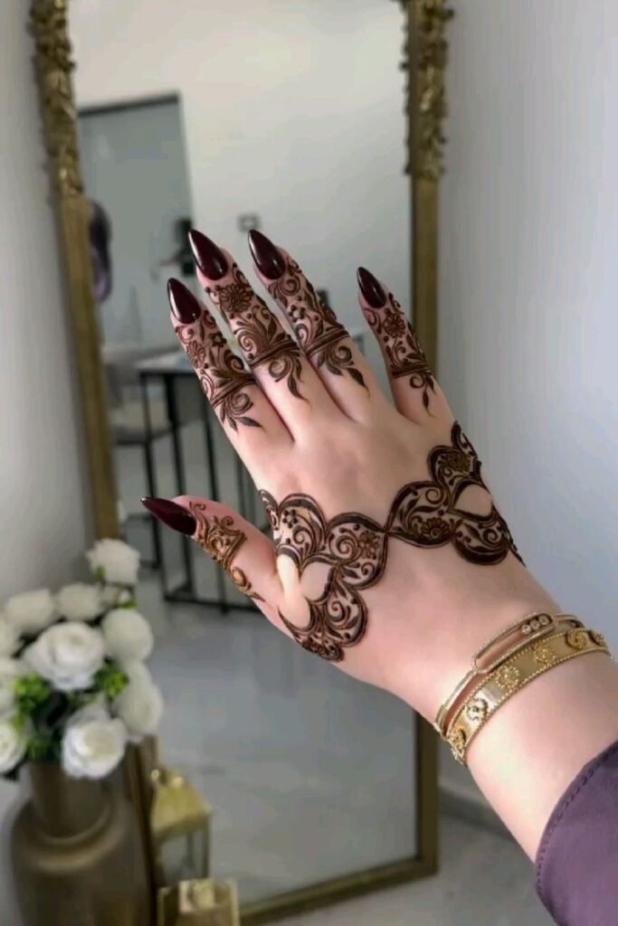 Bold Arabic mehndi designs use thick lines and dark mehndi for a strong look. The fingers are usually more filled while the back hand remains balanced. These designs are ideal for parties and festivals.