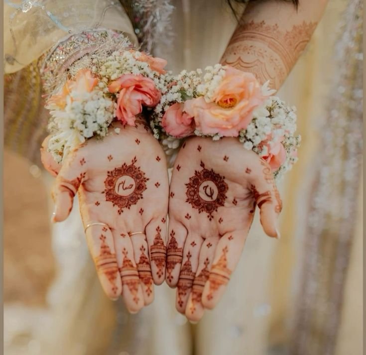 A circular mandala or circle in the palm (Pakistani touch) filled with Arabic petals and shaded leaves.