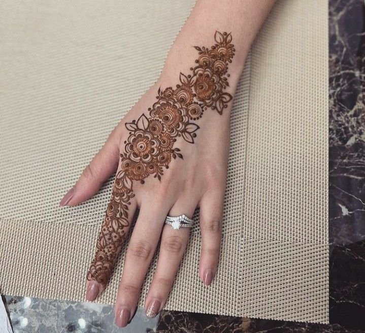 A signature Arabic pattern starting from the finger, flowing to the wrist, and decorated with Pakistani heavy flowers.