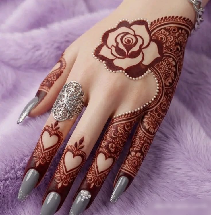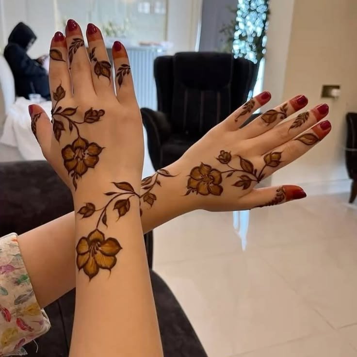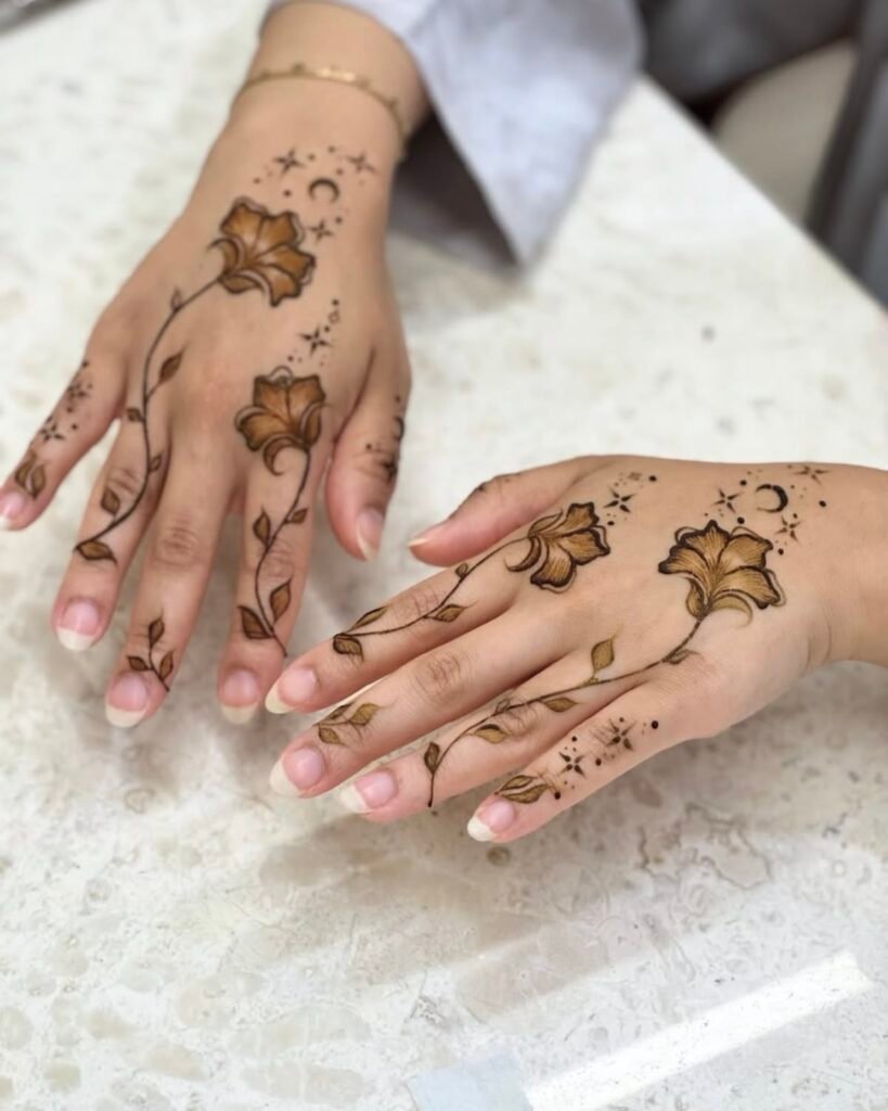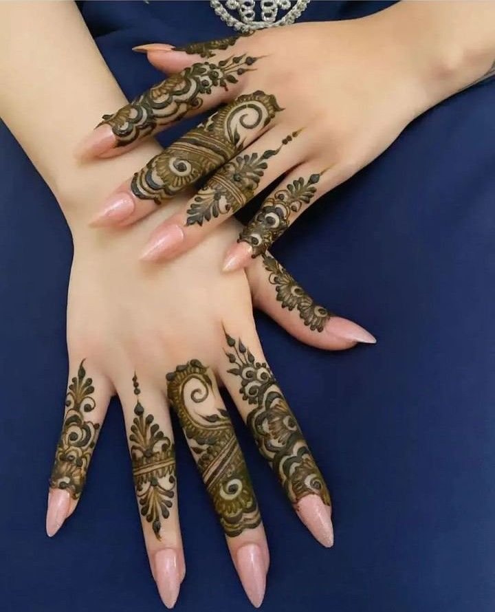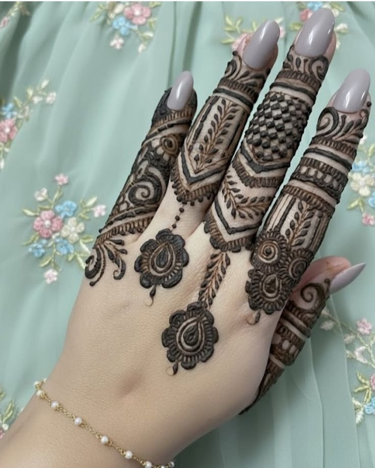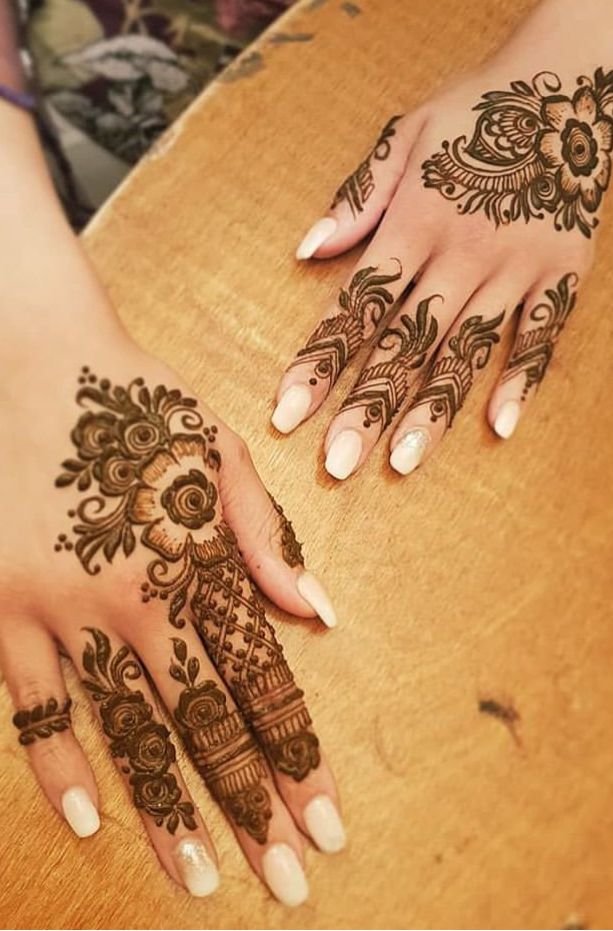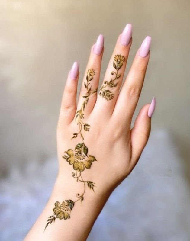 In this design, the fingers are decorated with detailed patterns while the back hand has a small floral motif. It looks minimal and trendy.