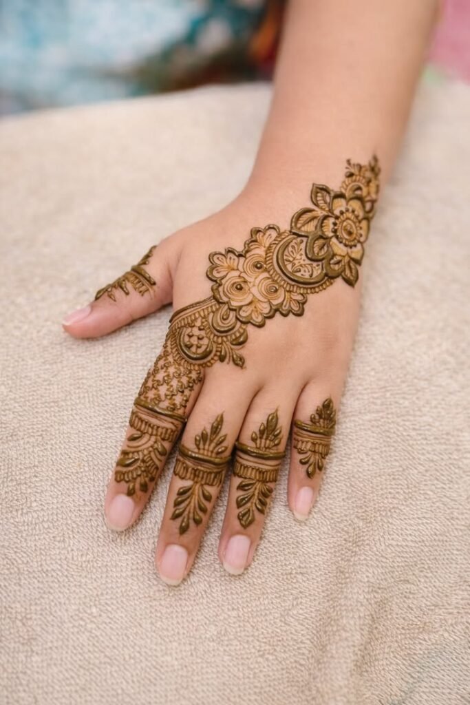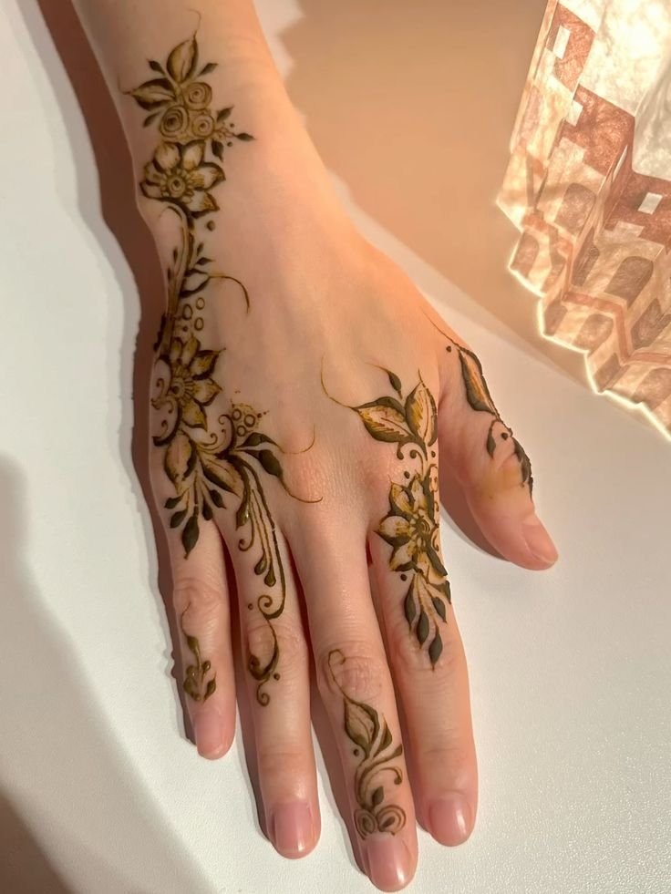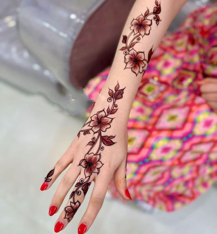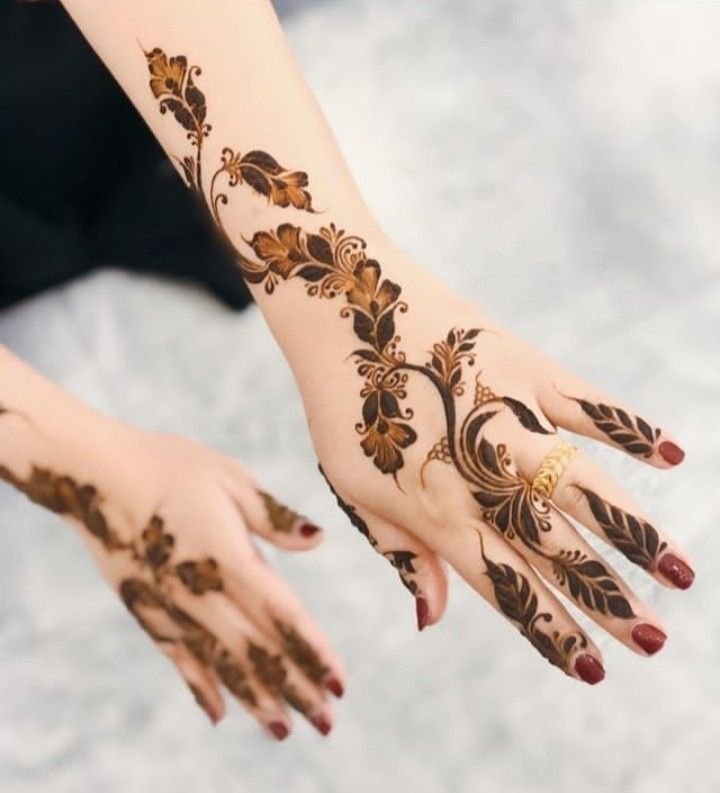 Back Hand Arabic Mehndi Design Simple styles are very popular because they look elegant and stylish without being too heavy. Arabic mehndi designs usually feature bold flowers, leafy vines, and flowing patterns that create a beautiful look on the back of the hand. These designs are perfect for weddings, Eid celebrations, parties, and even casual events.