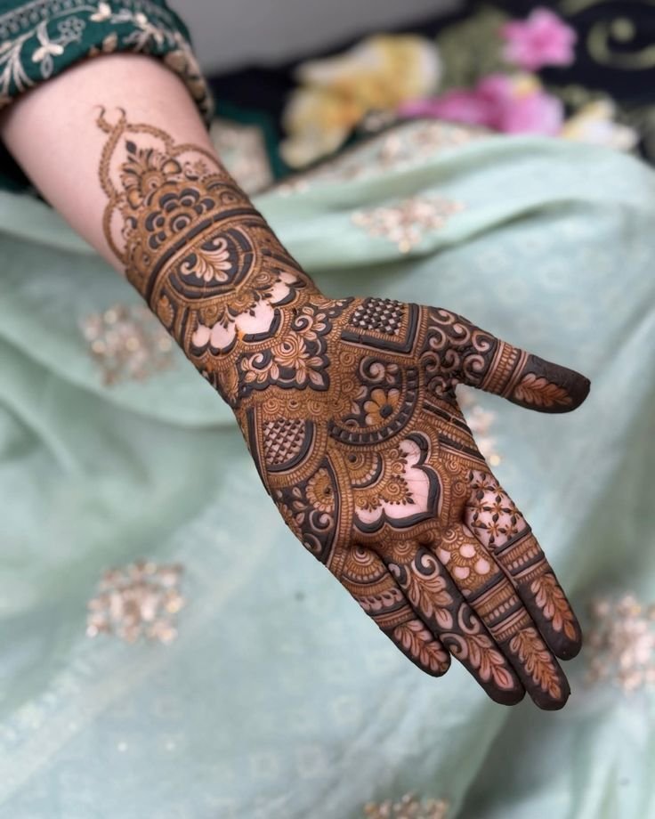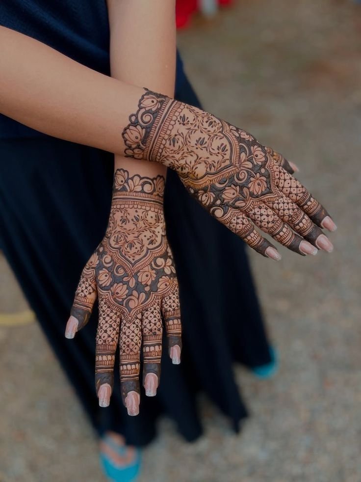 Bold outlines combined with dense floral filling and shaded leaves give Arabic heavy mehndi a modern royal look.