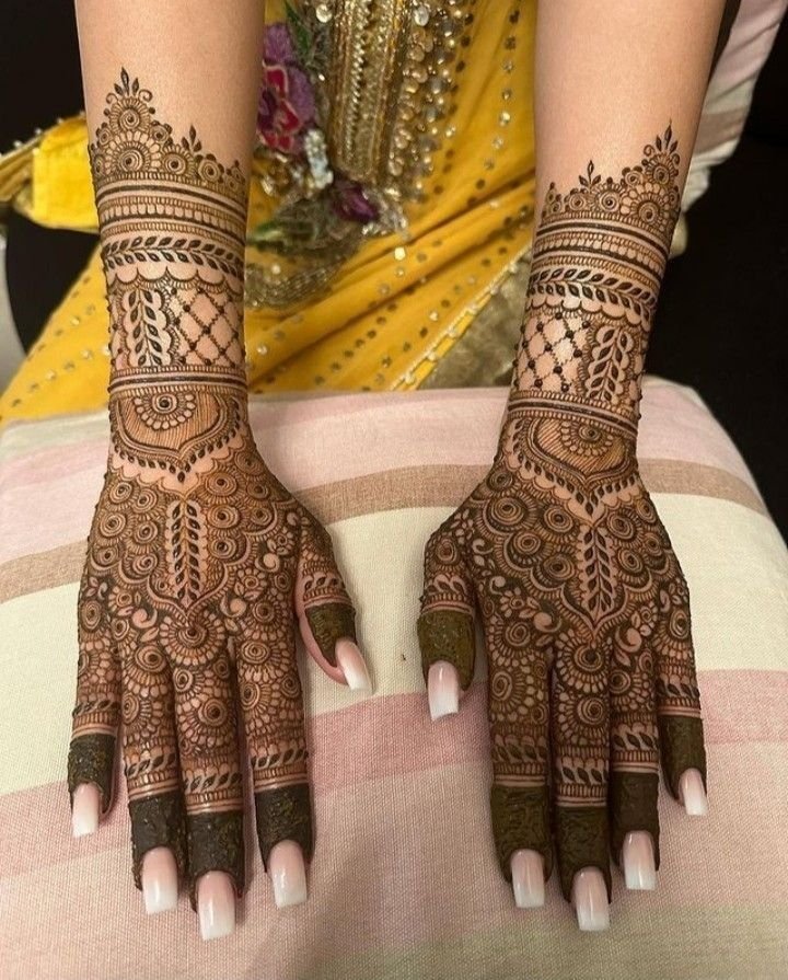 Bridal mehndi covers hands and arms with extremely detailed motifs, including flowers, peacocks, paisleys, and traditional elements.