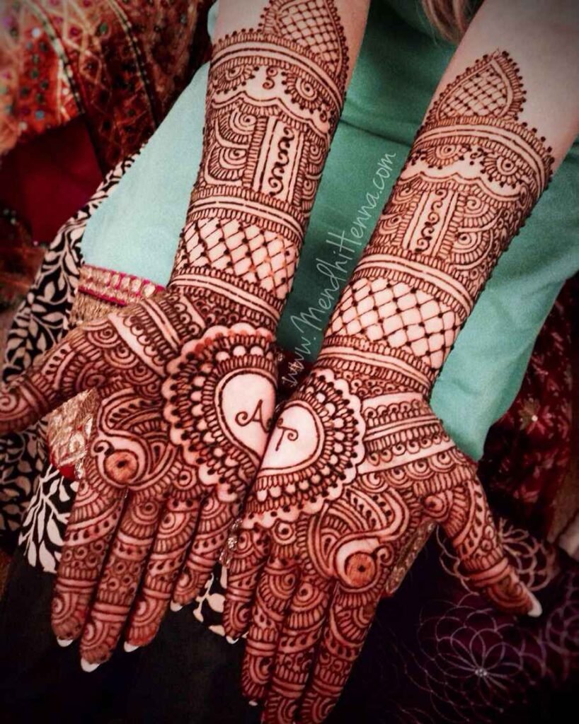 Intricate floral and paisley patterns covering the hands with the groom’s name hidden inside.