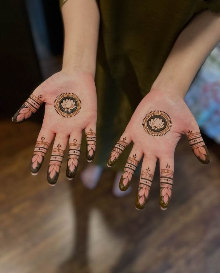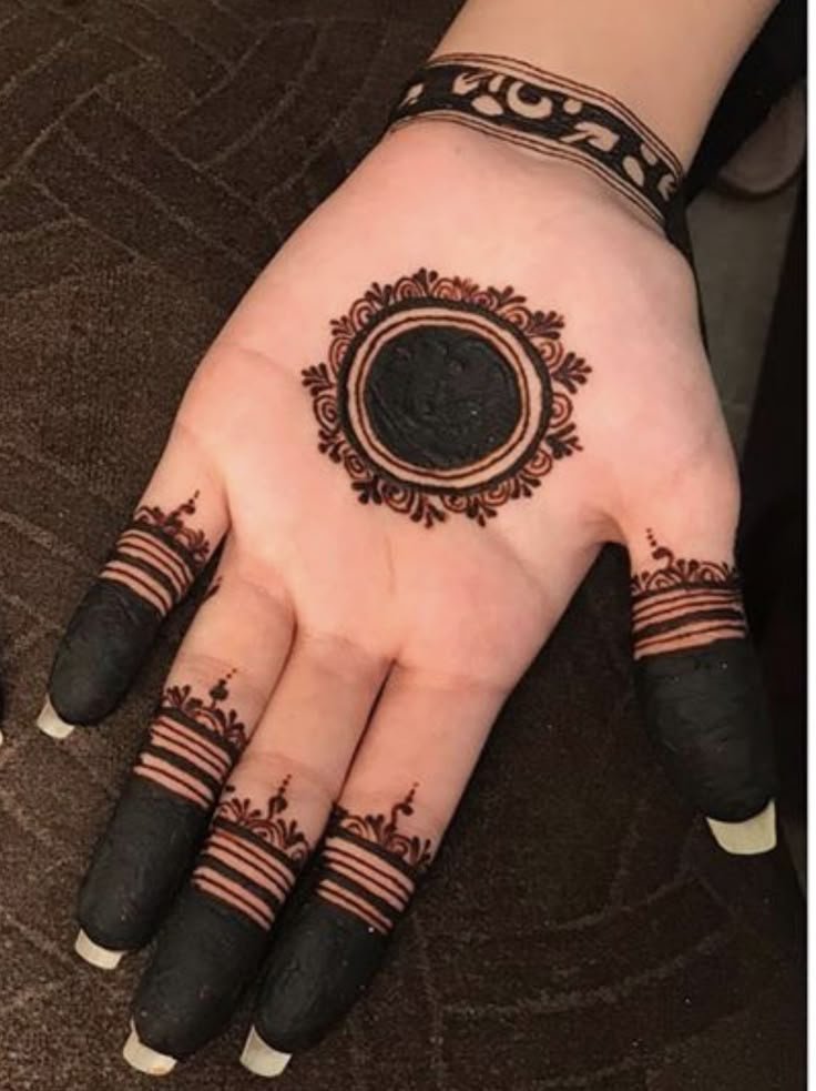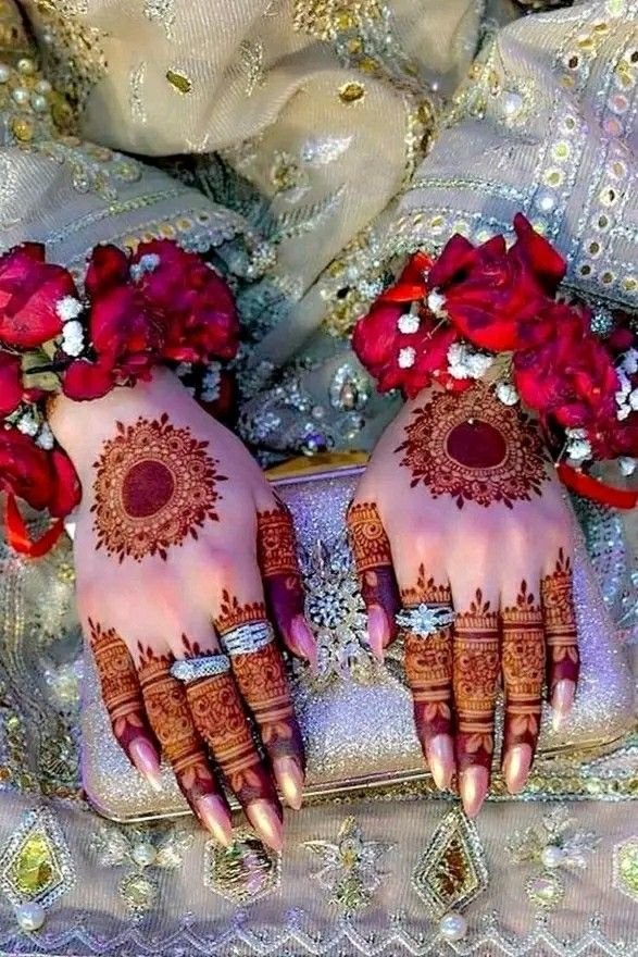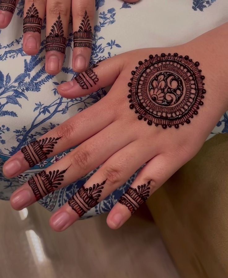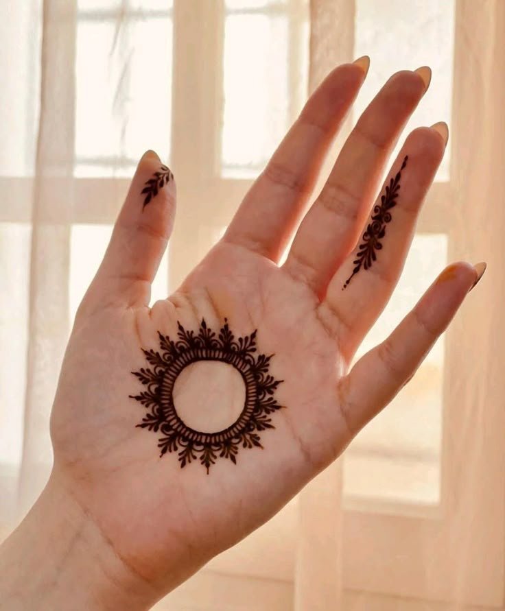 A basic circle drawn in the middle of the palm with tiny dots and petals around it. Perfect for minimalistic looks or festive events.