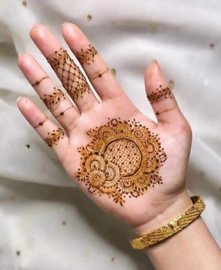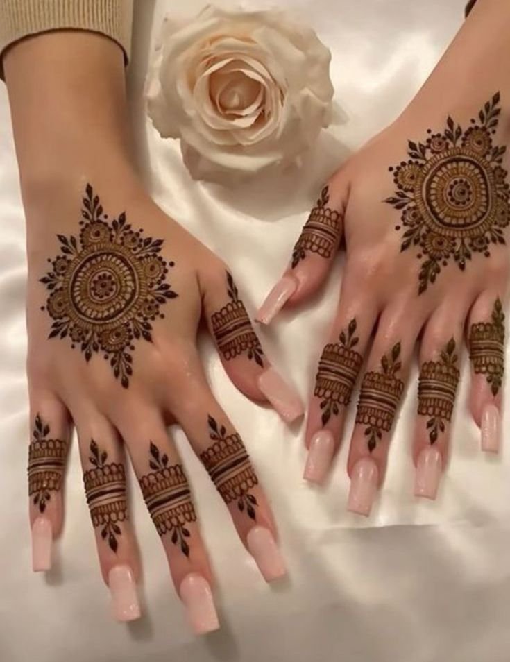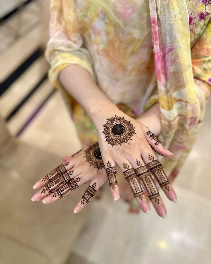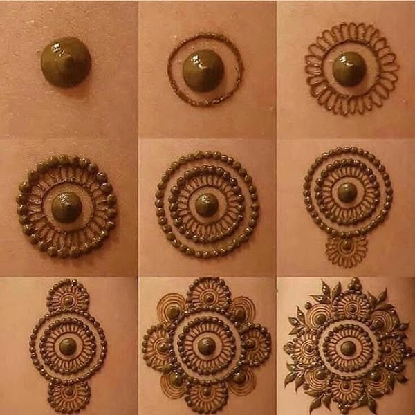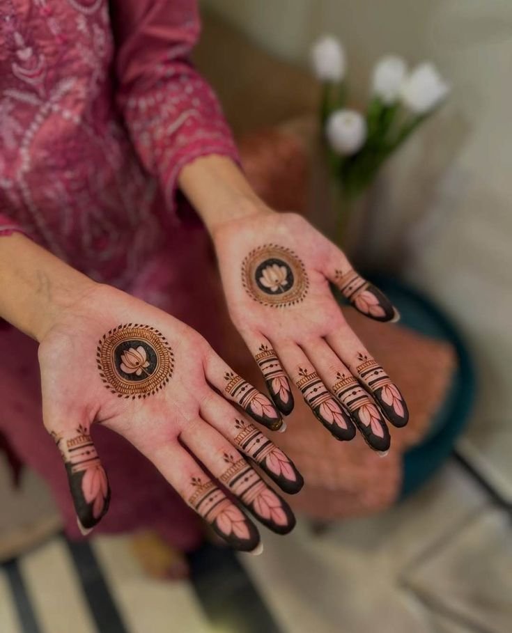 A basic circle drawn in the middle of the palm with tiny dots and petals around it. Perfect for minimalistic looks or festive events.