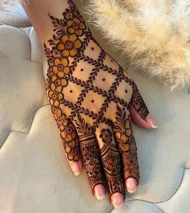Dubai mehndi often has checkered net designs with tiny floral dots, giving a stylish and modern vibe.