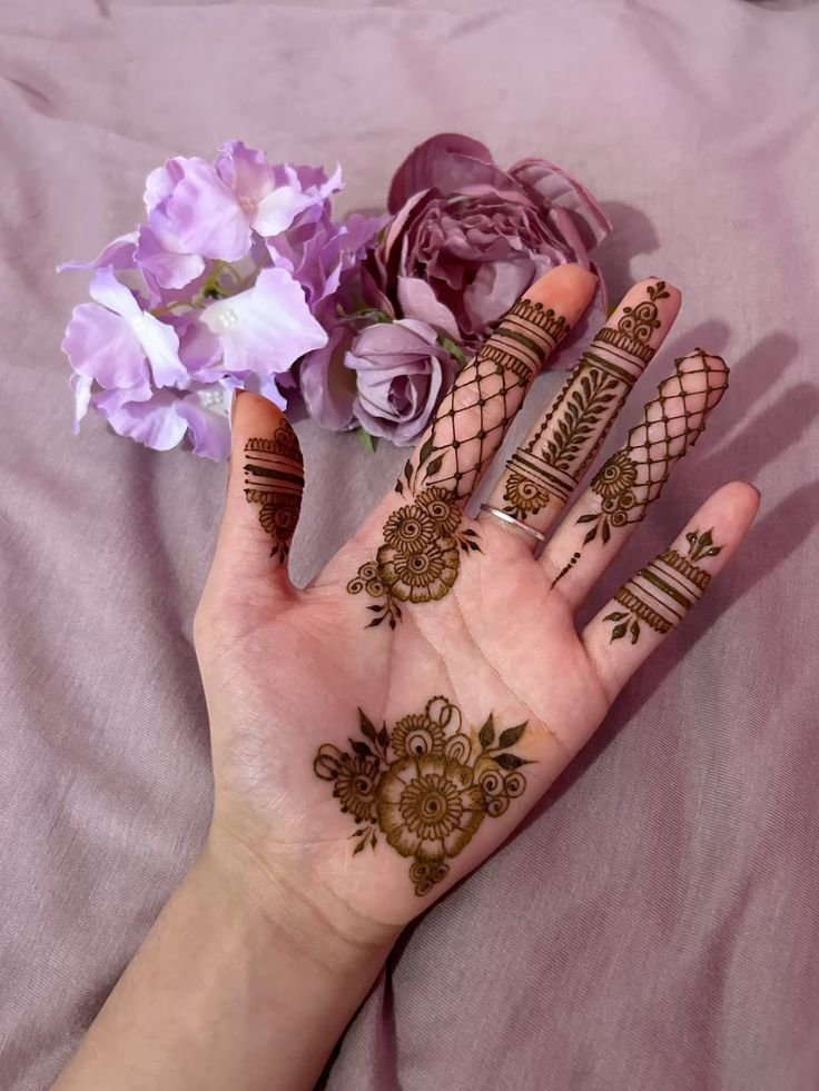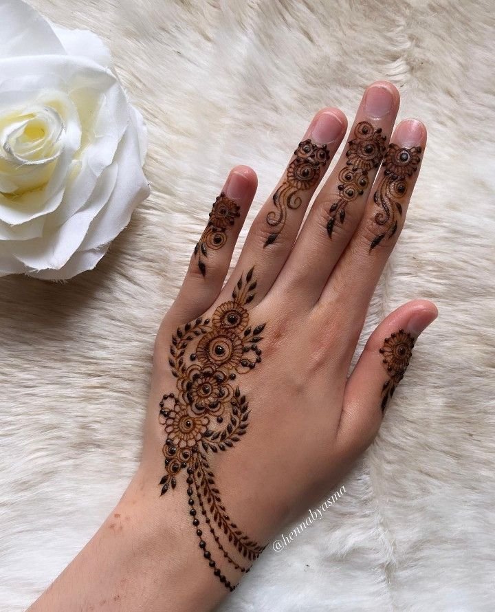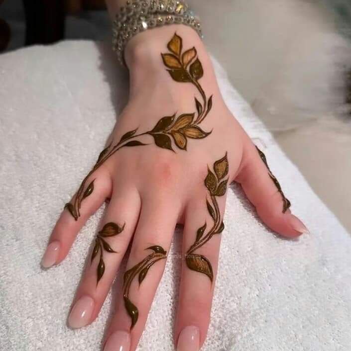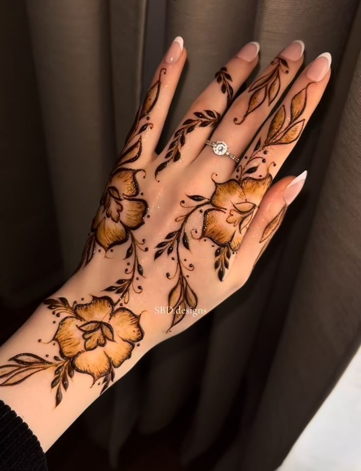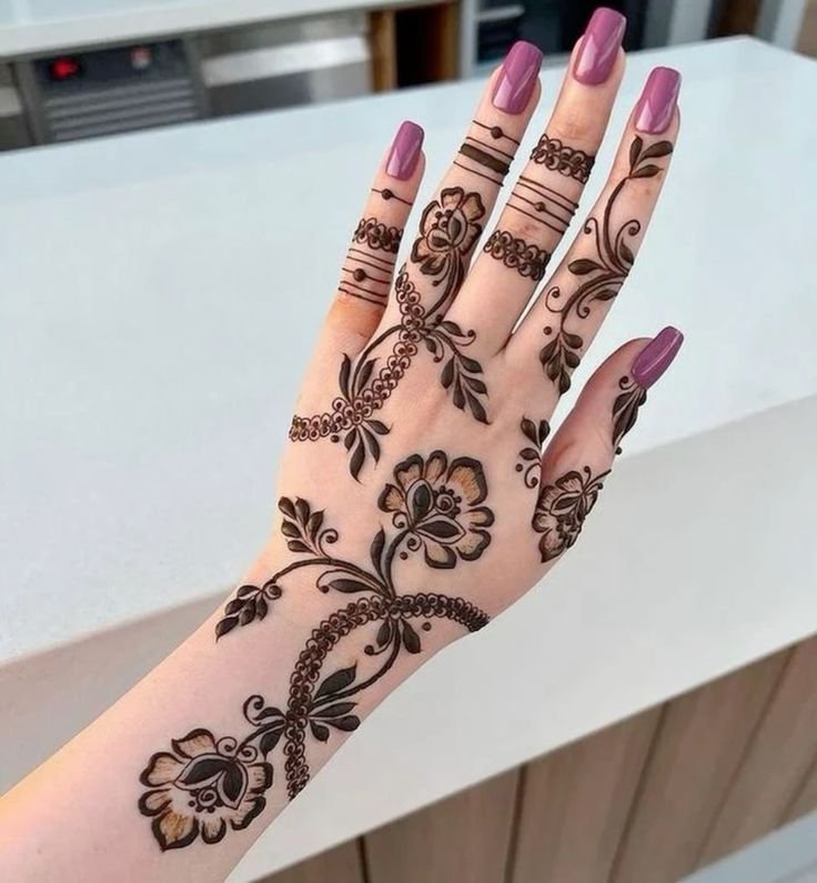 These designs use flowers, vines, and leaves running across the palm and wrist. They are elegant and perfect for festive events.