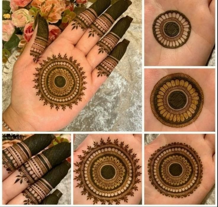 A traditional circular design drawn in the center of the palm — easy yet stylish.