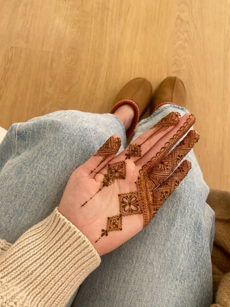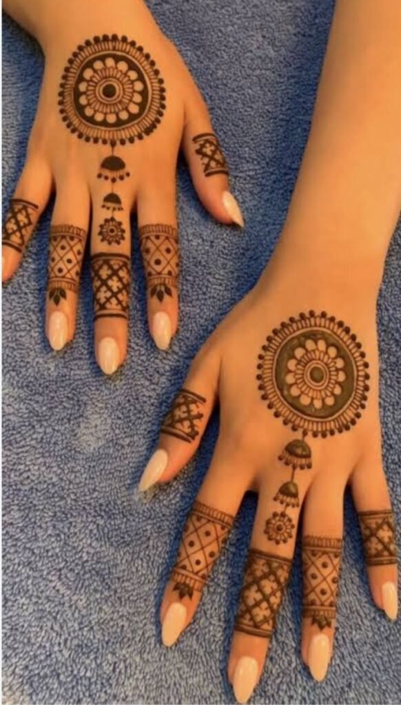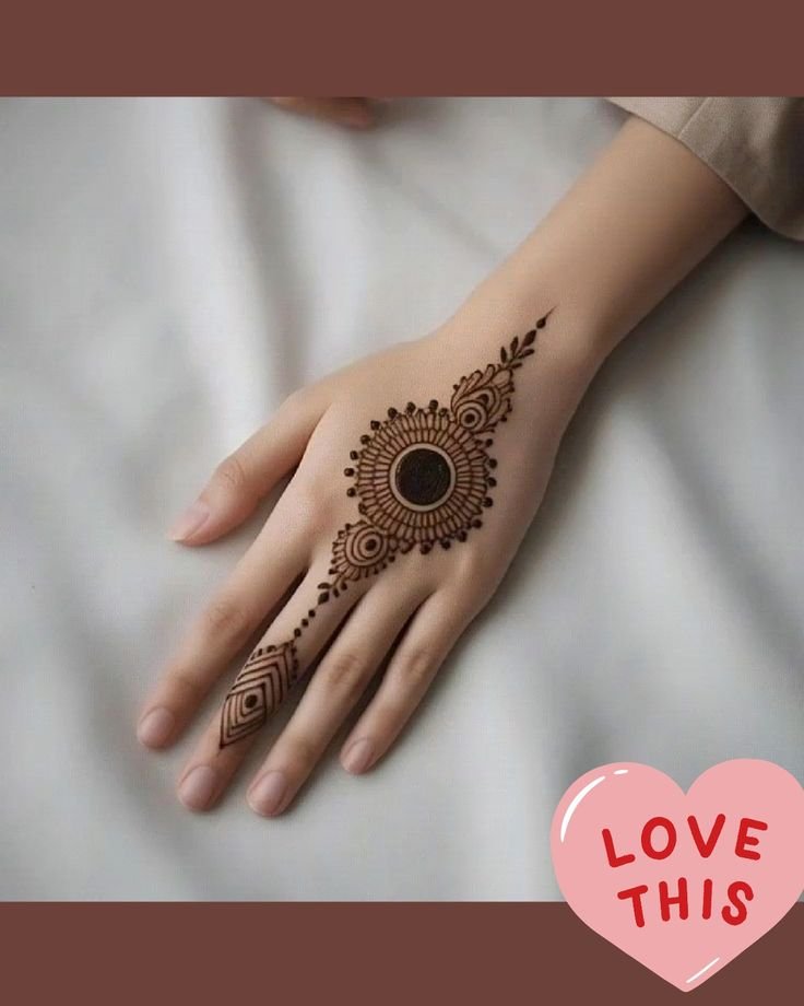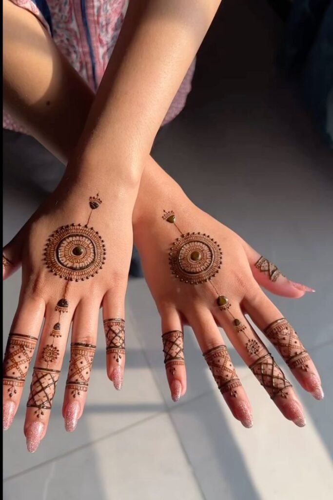 Instead of tikki, mandala chain mehndi is a beautiful option. A round mandala is drawn in the center, and chain patterns extend from it to the fingers or wrist, giving a balanced and traditional touch.