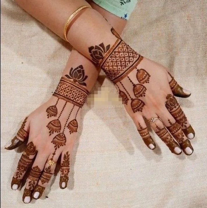 The jhumka style adds small earring-like motifs with chain lines. It looks trendy and unique, especially on the back side of the hand.
