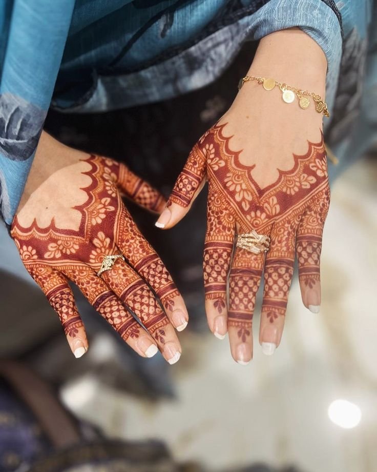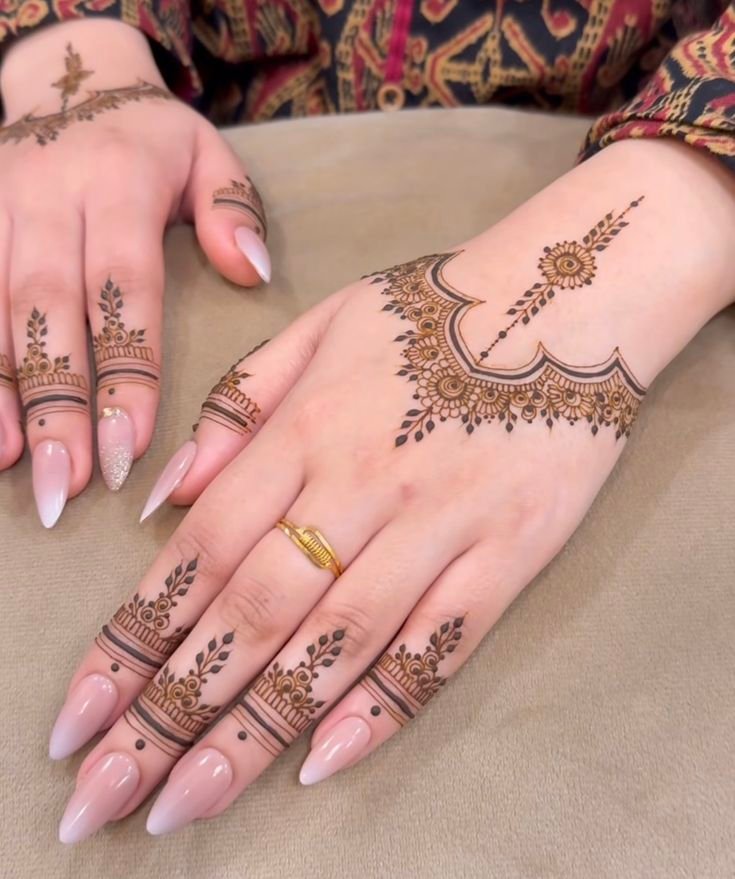Arabic mehndi is always a favorite. It flows beautifully with bold outlines and spaces that highlight the design. Brides can choose delicate Arabic trails that go from finger to wrist, making the hands look stylish without being too heavy.