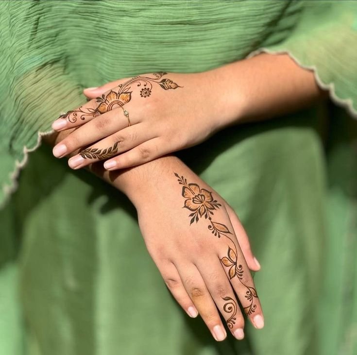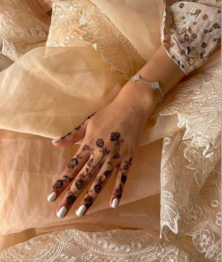 Arabic-inspired finger mehndi uses flowing lines, leaves, and open spaces for an elegant touch.