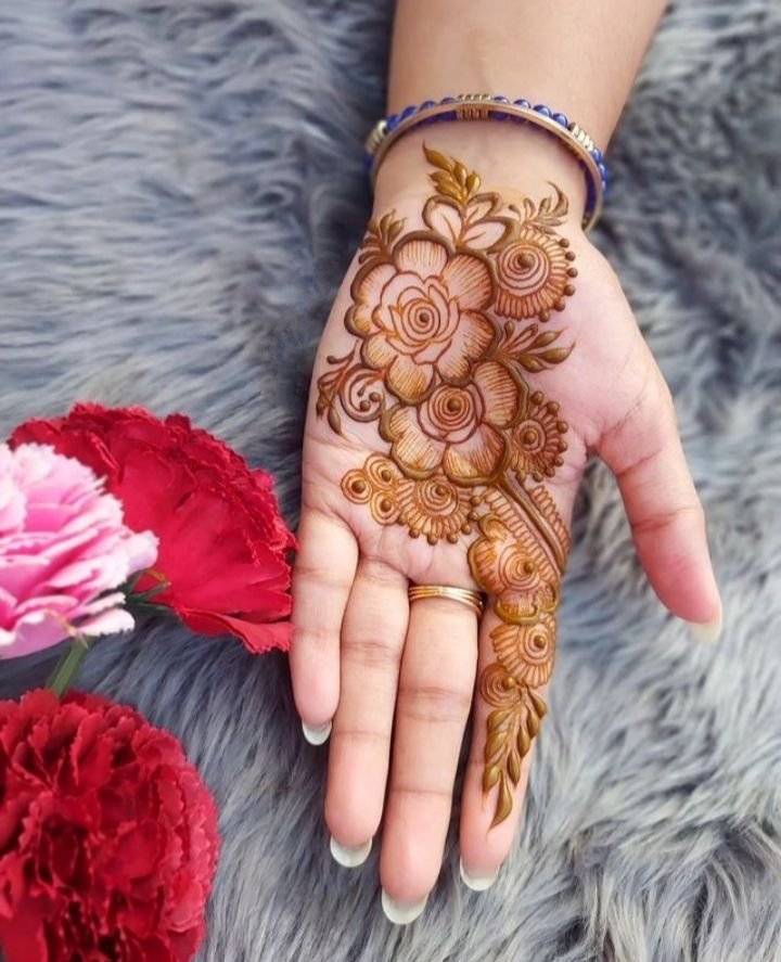 Arabic-style floral mehndi features big flowers and flowing vines starting from one side of the hand to the fingers. It gives a graceful and stylish touch.