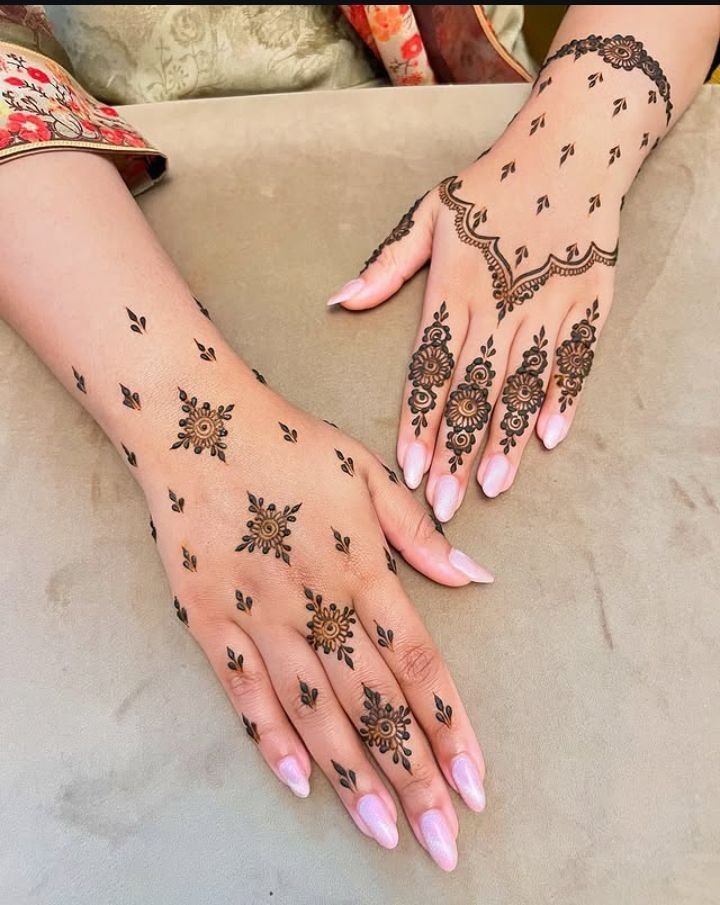 For girls with less time, quick floral mehndi designs are ideal. Small flowers and vines on the corners of the palm and fingers give a stylish yet simple look.