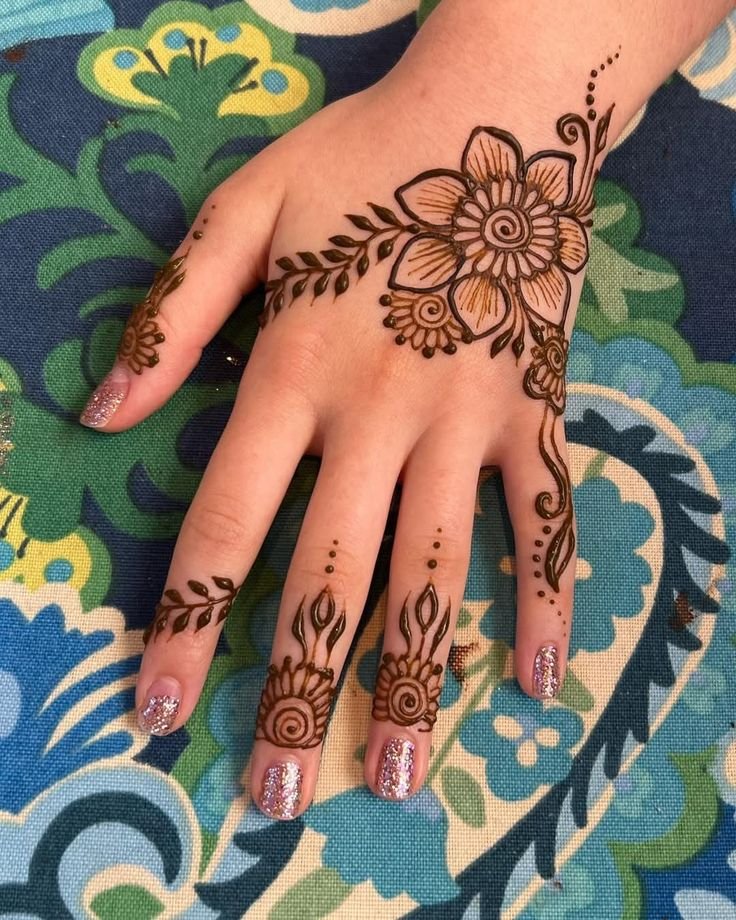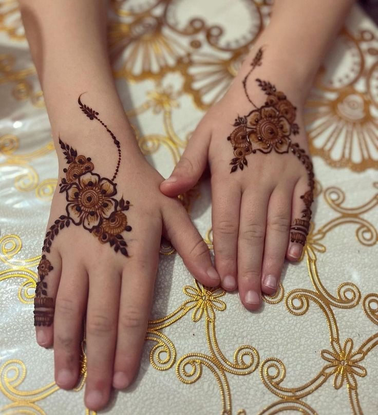 For kids, mehndi should always look fun and adorable! Cute flower mehndi design for kids features small daisies, hearts, and tiny dots — simple yet full of charm. The design should be light and quick to apply, making it perfect for little girls who love to match their mothers at family events.