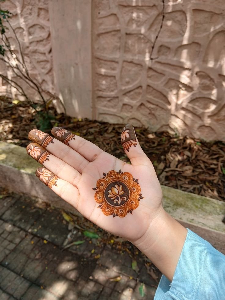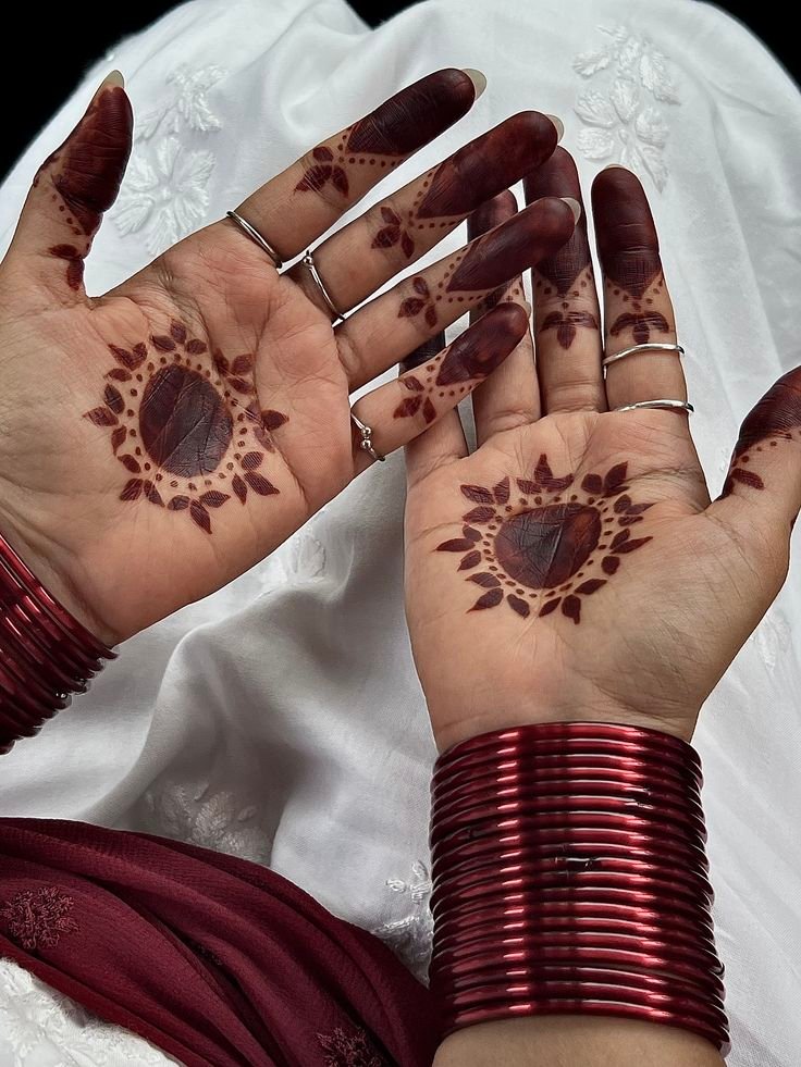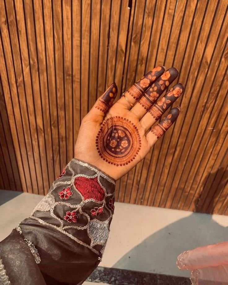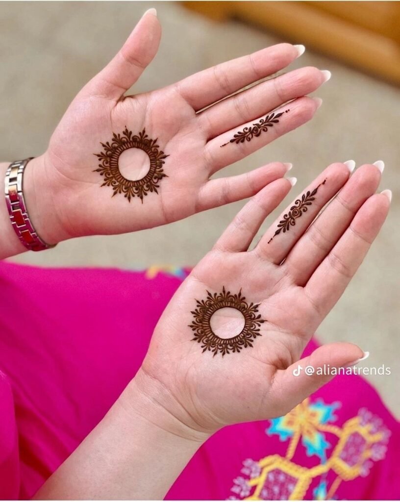 Front circle mehndi designs are perfect for a simple yet stylish hand look. These minimal circular patterns enhance palm beauty and are ideal for festive and casual occasions.