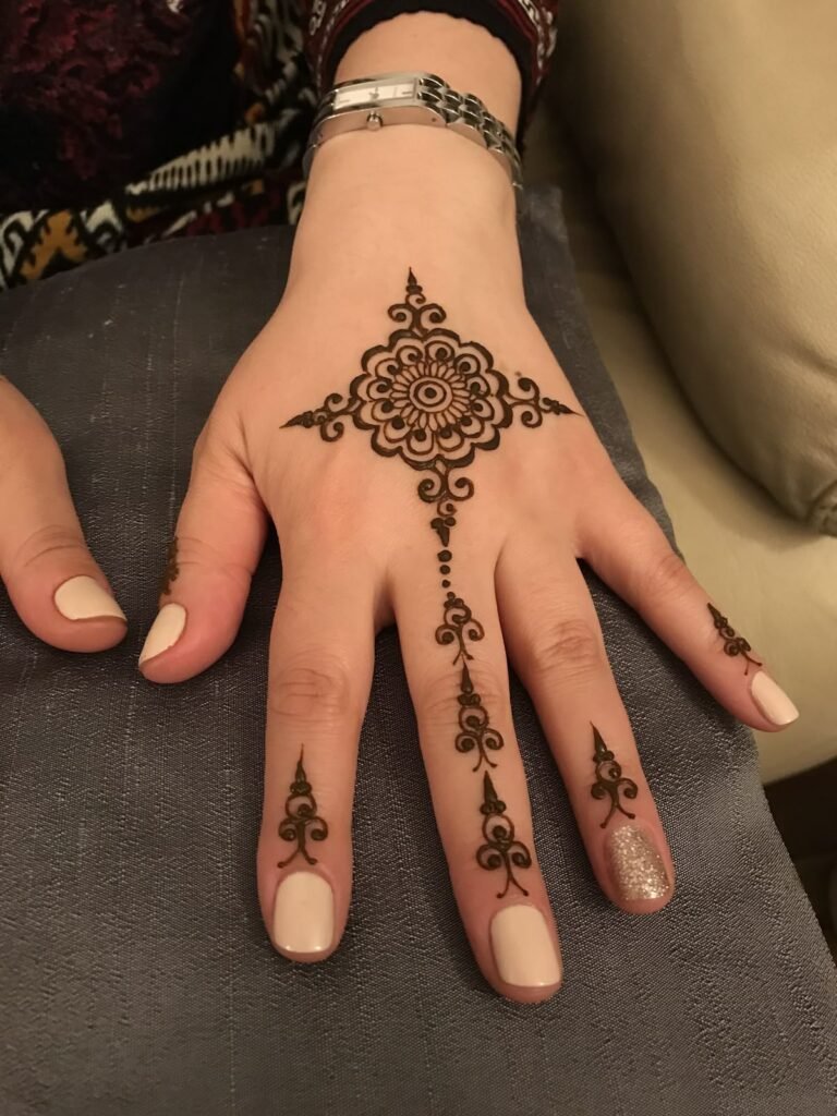 A small circle in palm center with thin lines going toward 1–2 fingers. Modern and aesthetic.