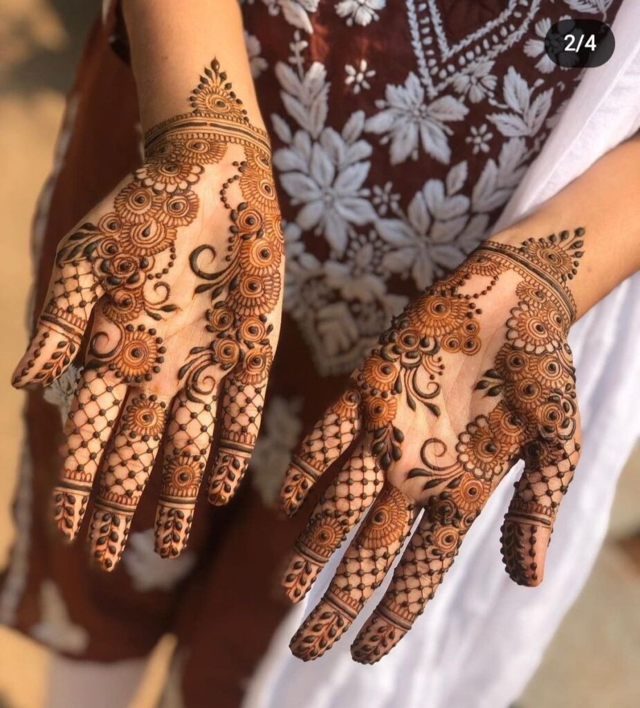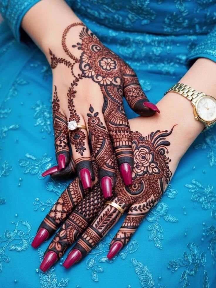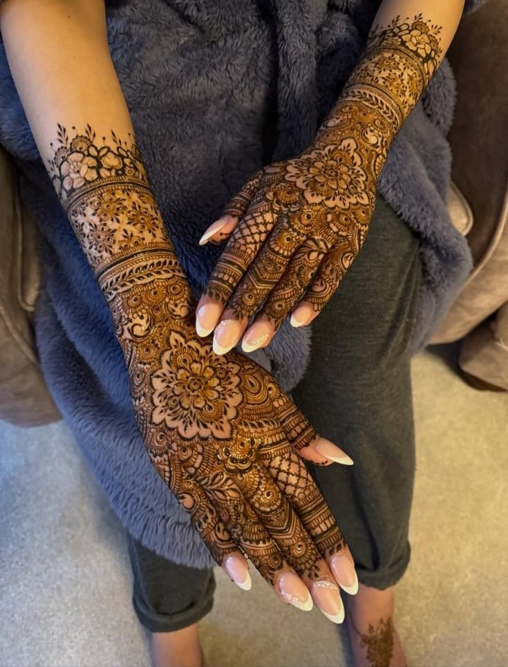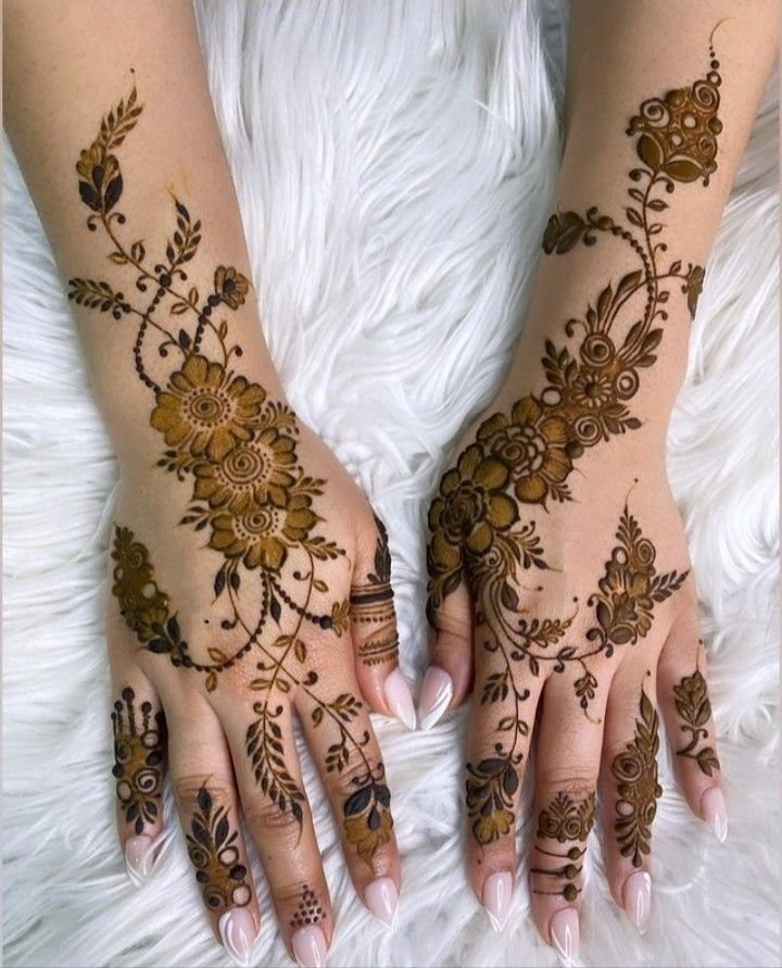 These designs cover the palm and fingers with connected patterns, perfect for brides and special events.