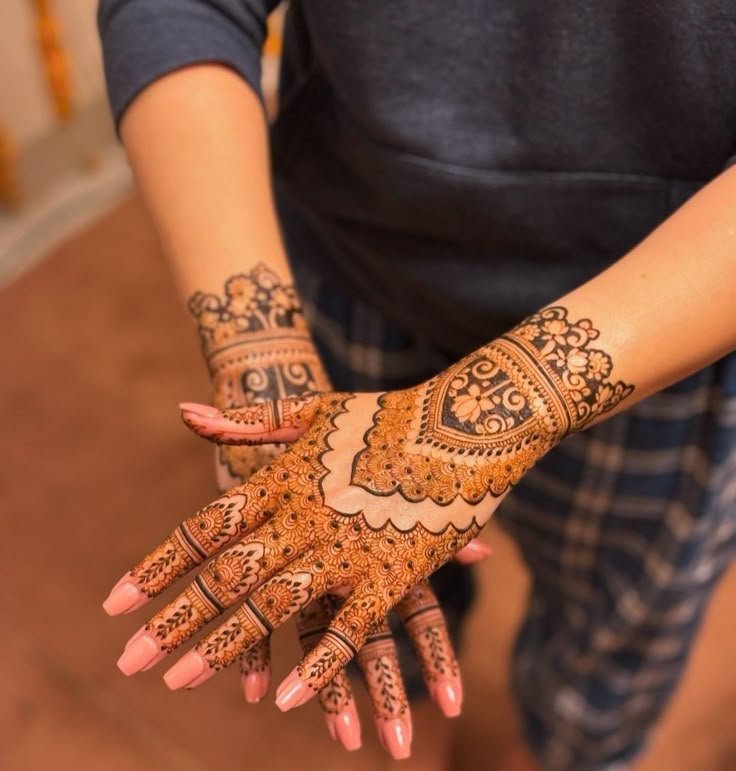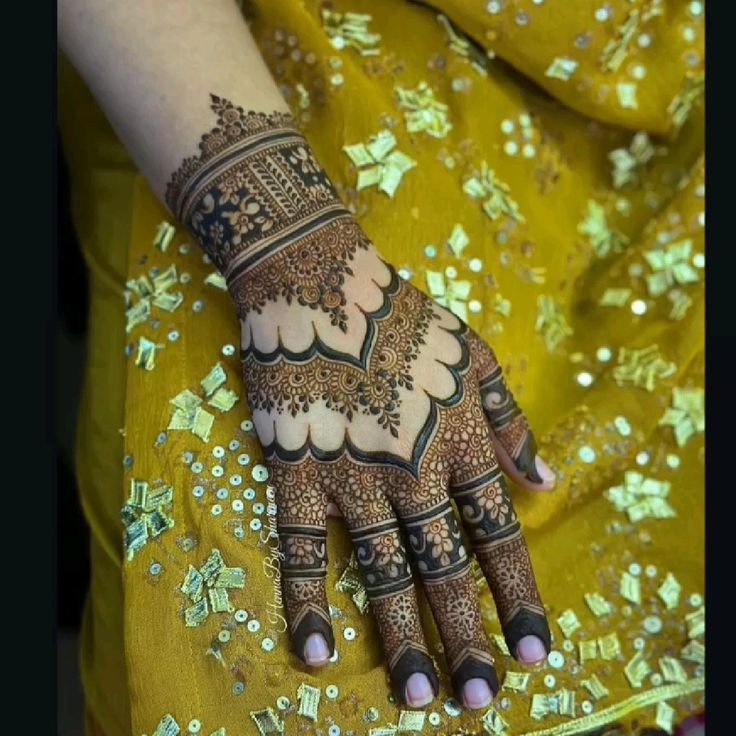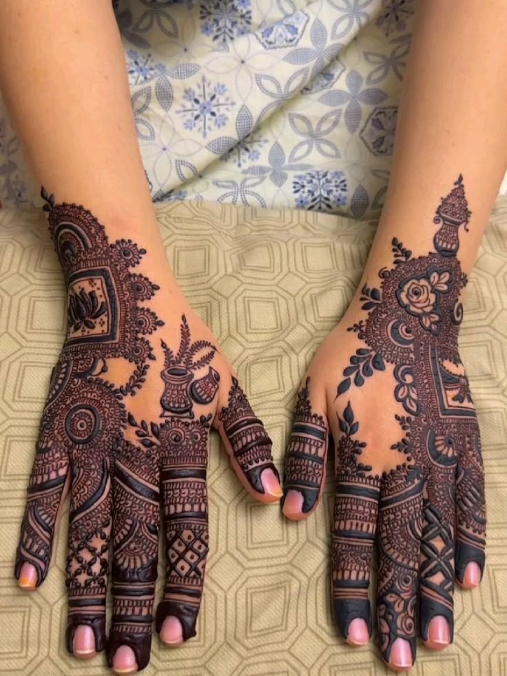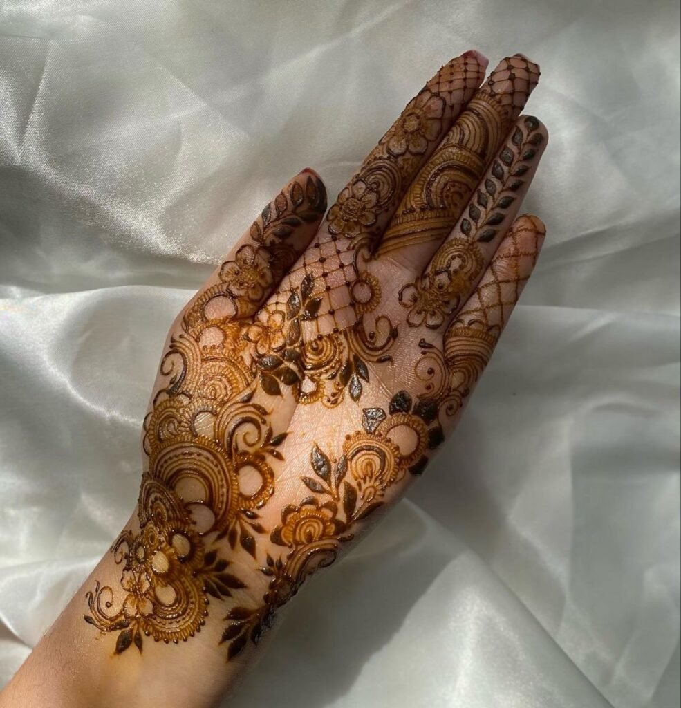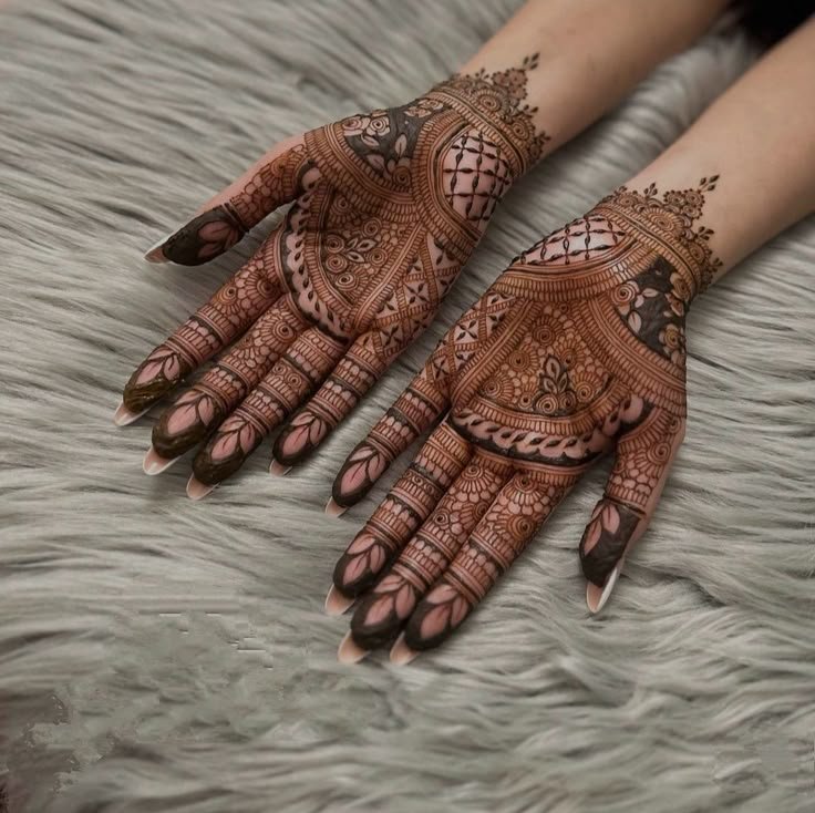 These designs cover the palm and fingers with connected patterns, perfect for brides and special events.