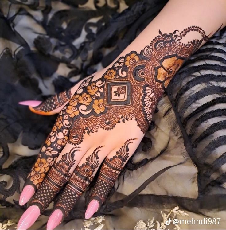 Bold floral patterns with filled spaces and neat finger designs look royal and stylish.