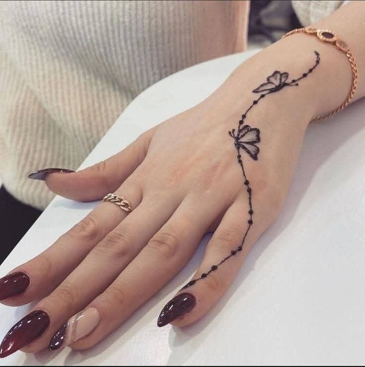 Simple mehndi for kids usually includes tiny flowers, smiley faces, butterflies, hearts, and star patterns. These designs are easy to draw and do not require complicated detailing. A small flower in the center of the hand or a tiny bracelet-style design on the wrist looks very cute on kids.