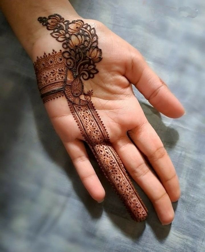 Arabic floral mehndi design front hand with leaf and vine pattern.