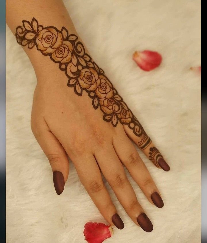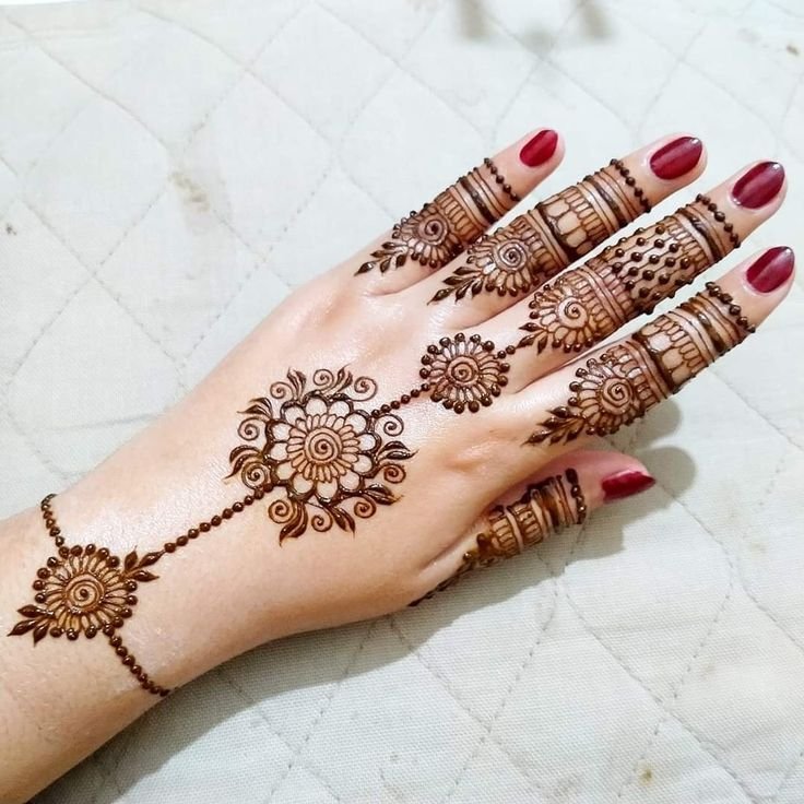 Bracelet-style designs focus on the wrist and front hand, creating the illusion of jewelry. It’s trendy, lightweight, and perfect for party wear.