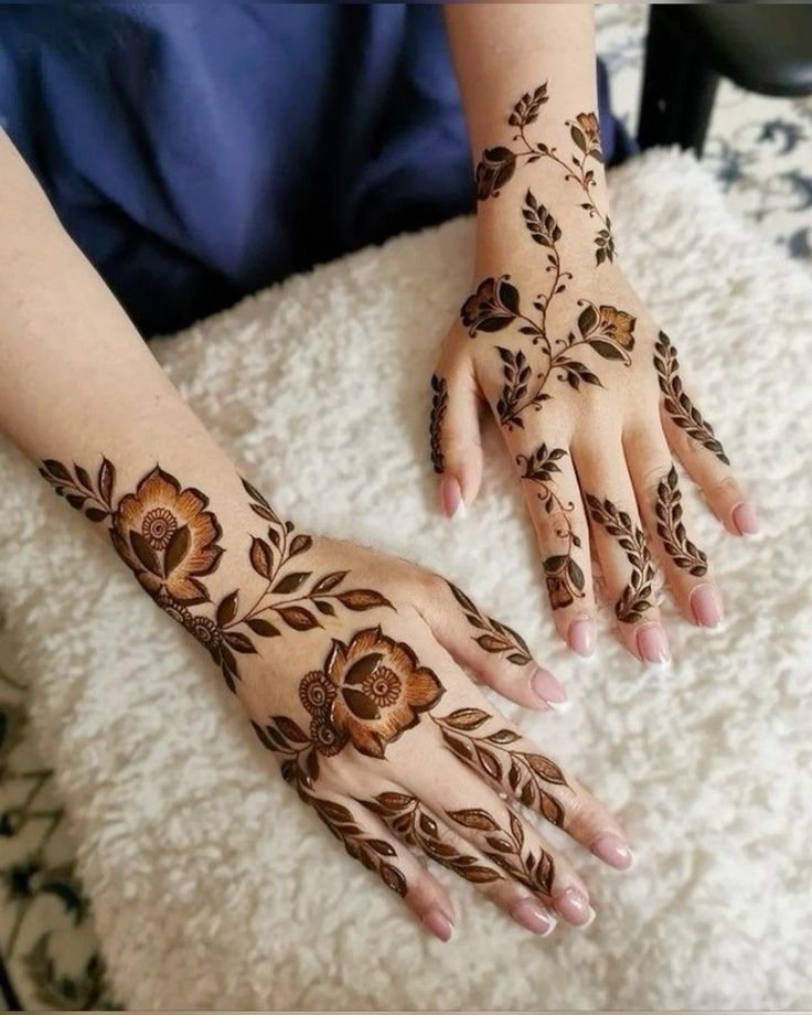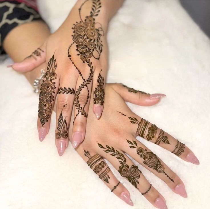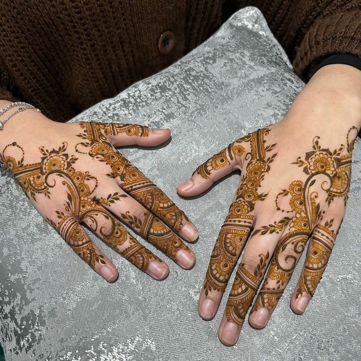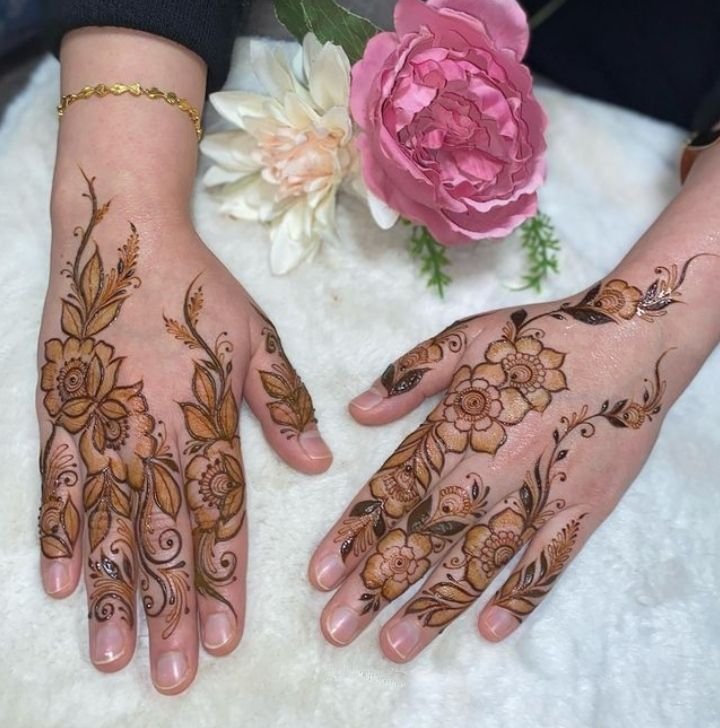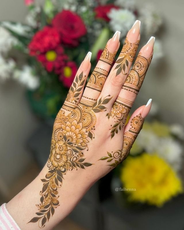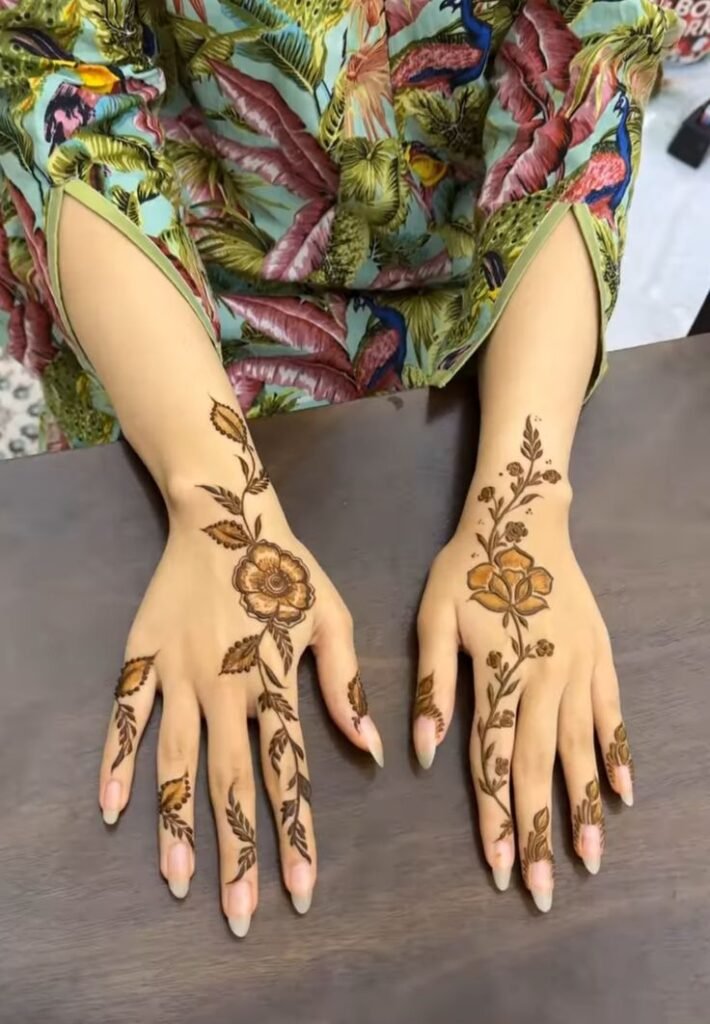 Soft floral motifs with thin outlines are a favorite choice. These designs usually cover the center of the palm or back hand while keeping fingers lightly detailed.