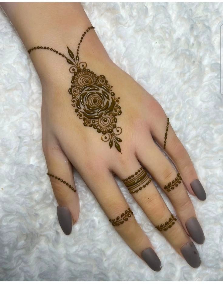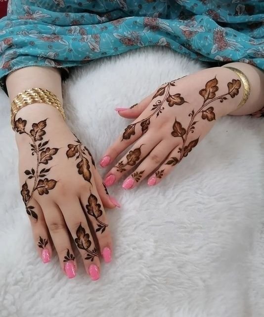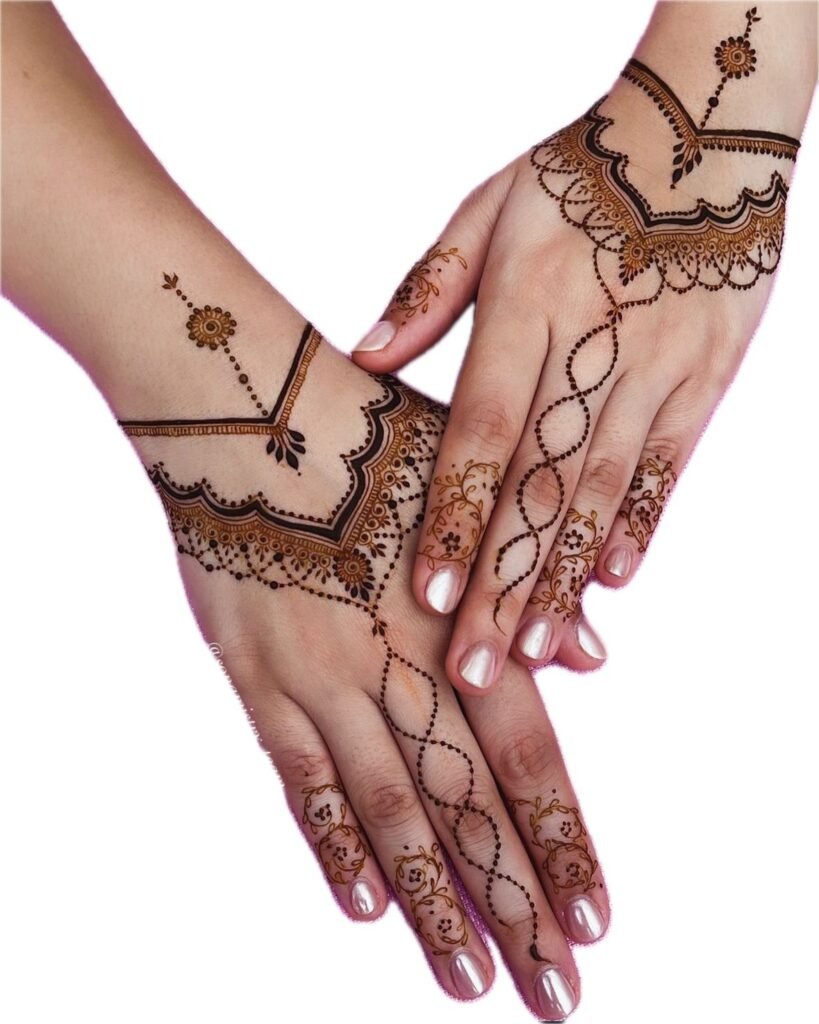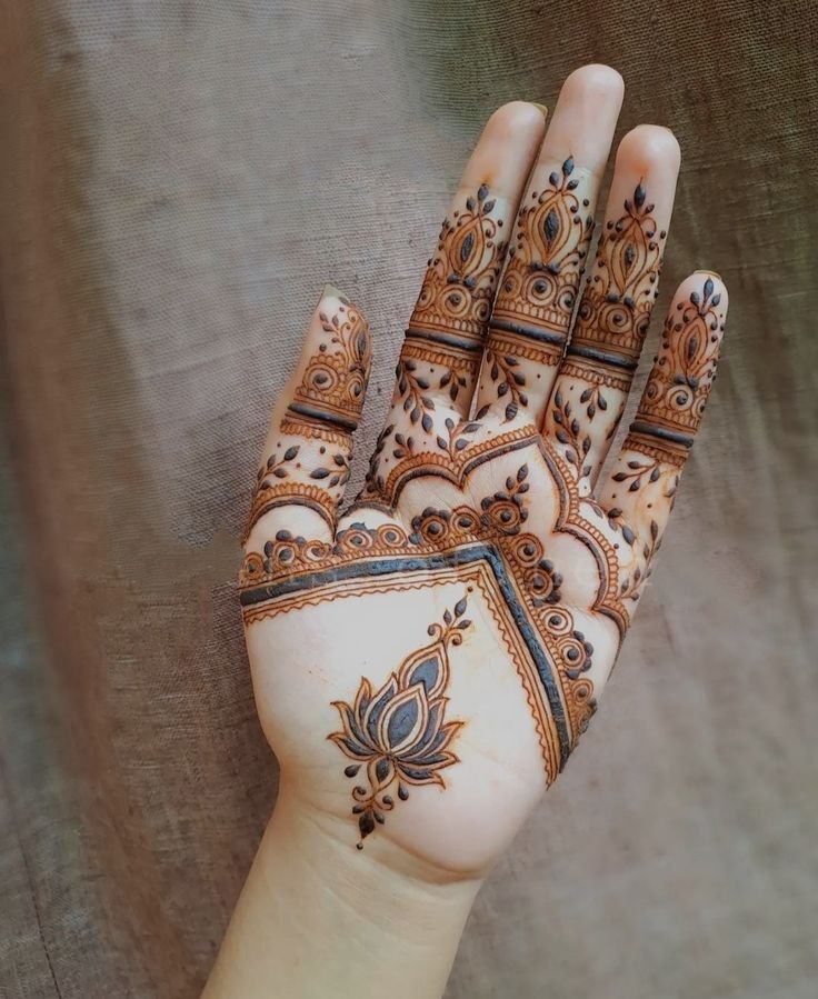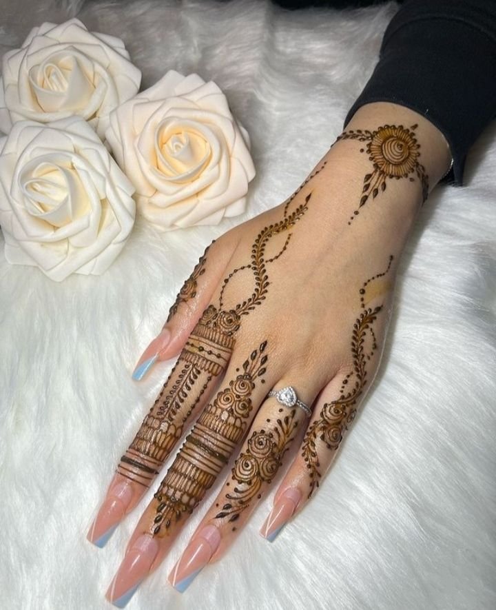 Soft floral motifs with thin outlines are a favorite choice. These designs usually cover the center of the palm or back hand while keeping fingers lightly detailed.