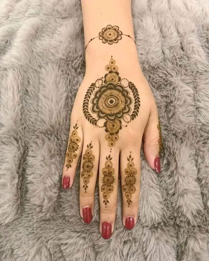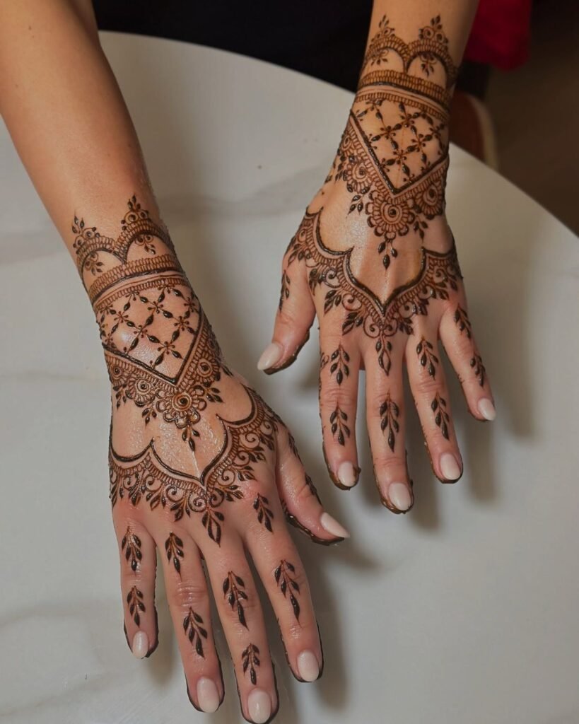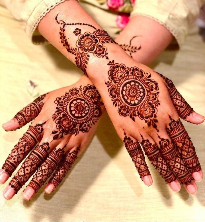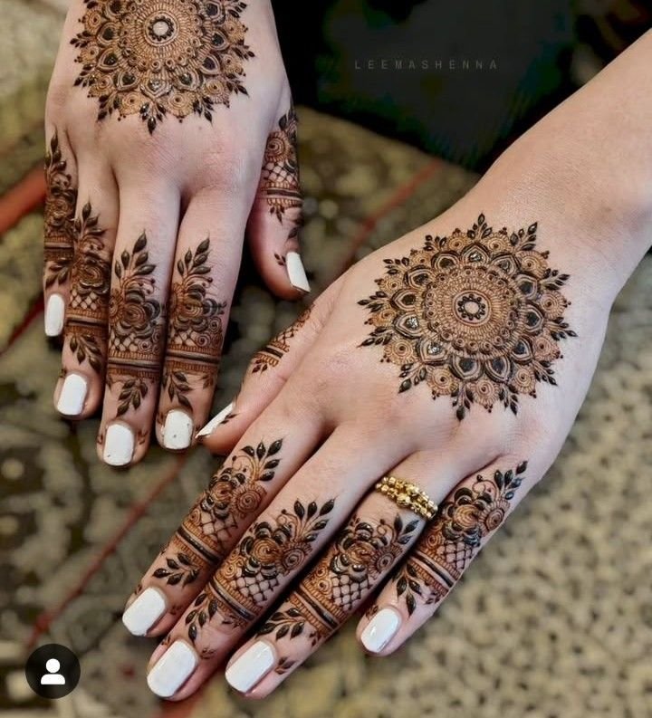 A single mandala in the center of the palm paired with delicate finger patterns gives a balanced and modern bridal appearance.