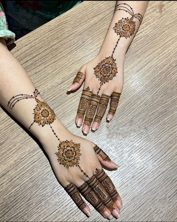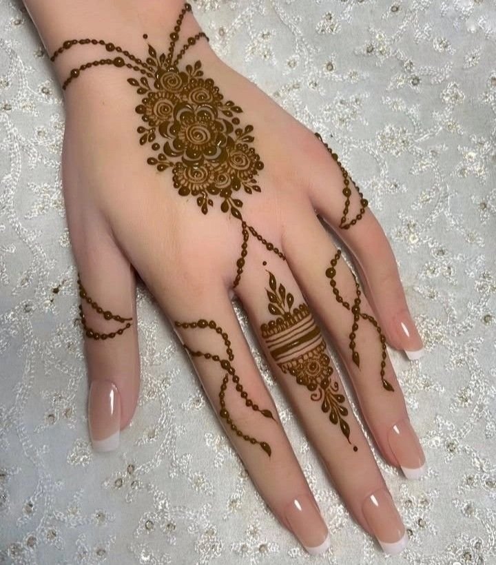 Bracelet-style trails around the wrist and ring finger connections are perfect for minimalist brides who love trendy mehndi designs.
