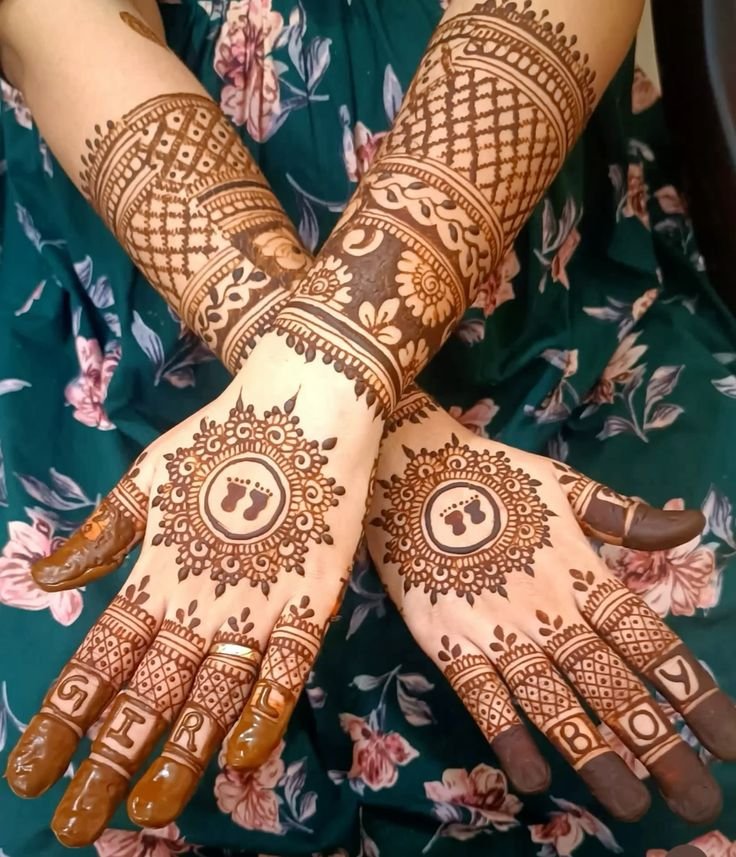 Baby shower mandala mehndi designs are deeply symbolic — they represent life, love, and new beginnings. Expecting mothers often choose these for their baby shower events because the circular design symbolizes growth and protection. These mehndi patterns can be applied on the hands or used as belly art using safe, natural henna.