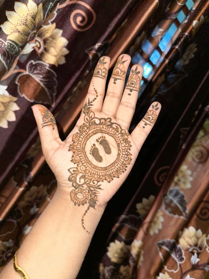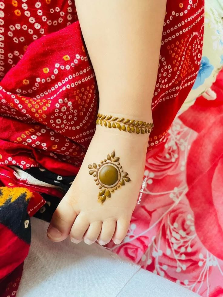 The baby mandala mehndi design is made specially for kids with soft, tiny patterns. Small circles and simple dots form a cute, minimal mandala that’s safe and gentle for their delicate skin. It’s often applied for family gatherings, weddings, or festive occasions to give little girls a fun and beautiful look.
