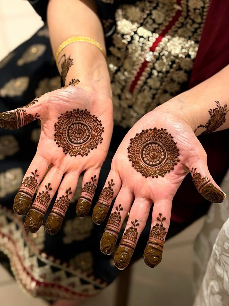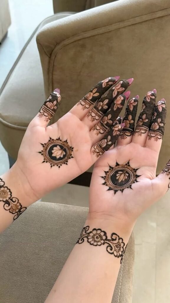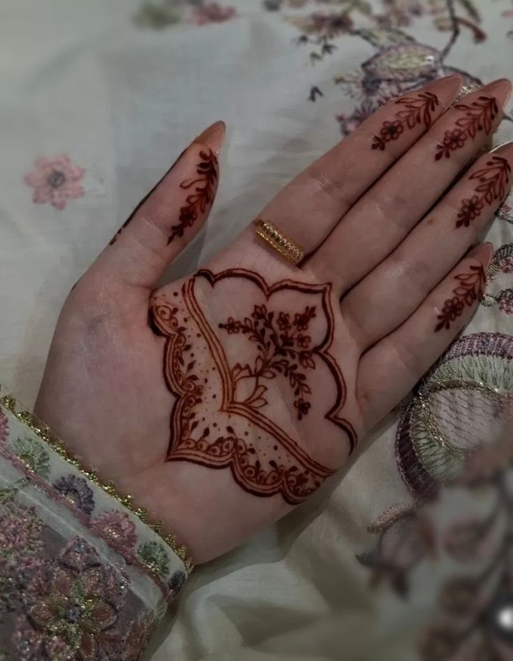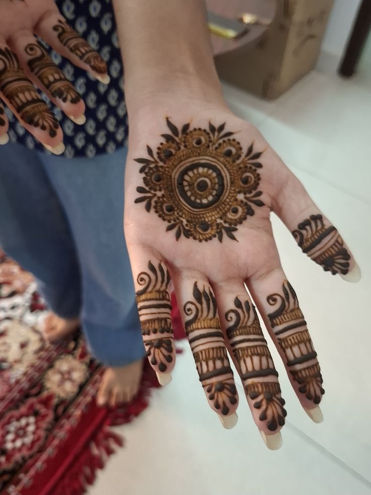 A small mandala placed in the center of the palm with simple finger lines adds balance and beauty.