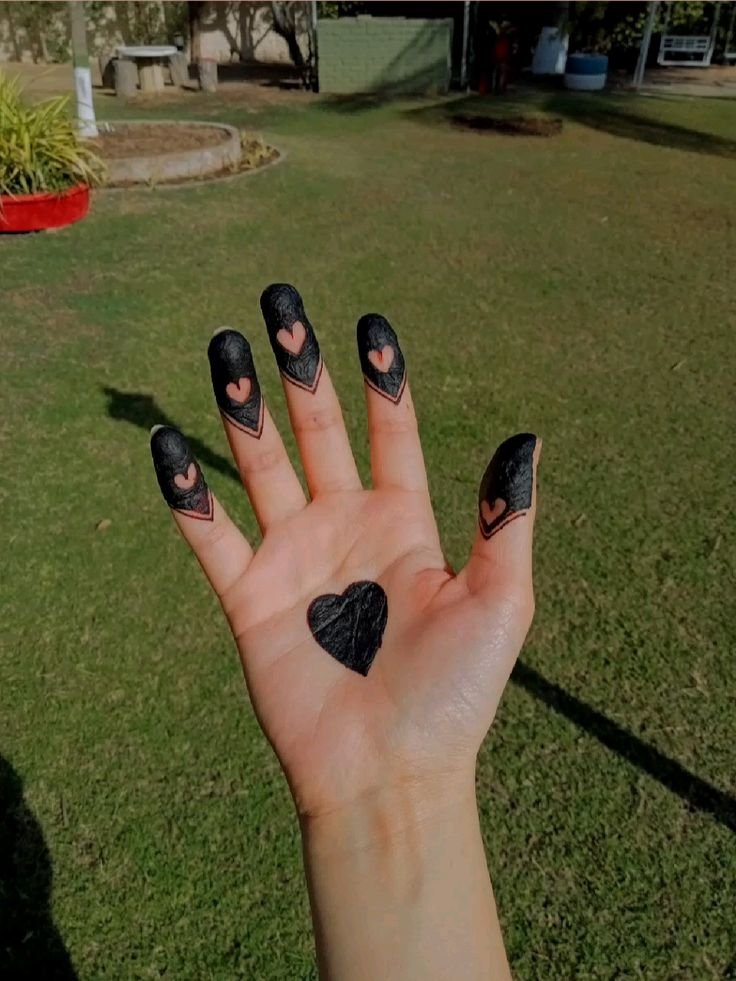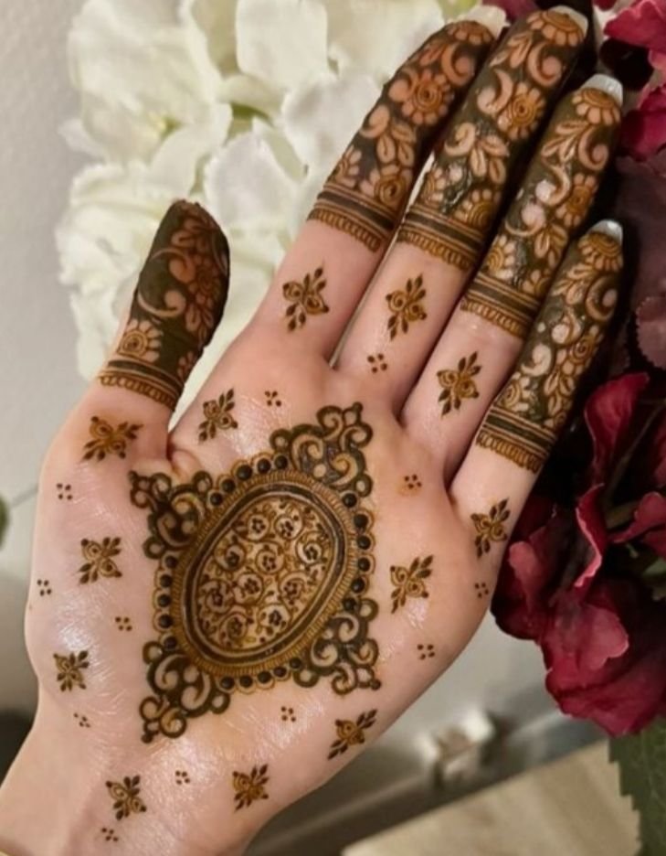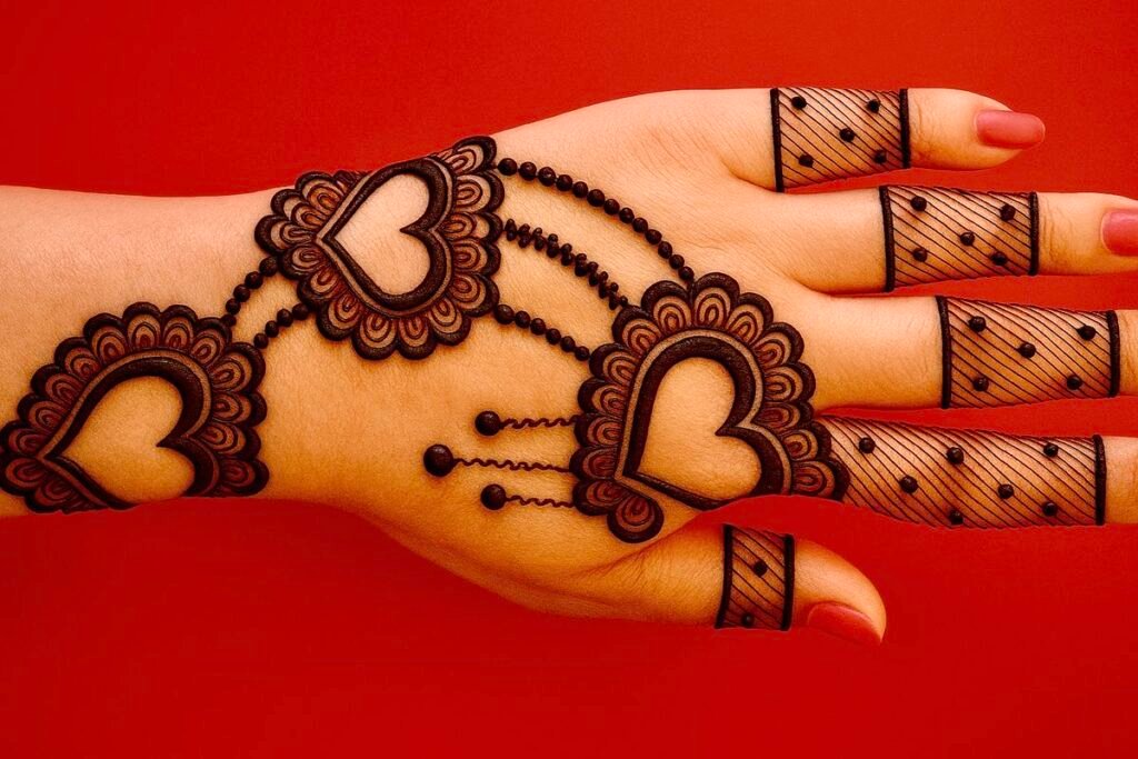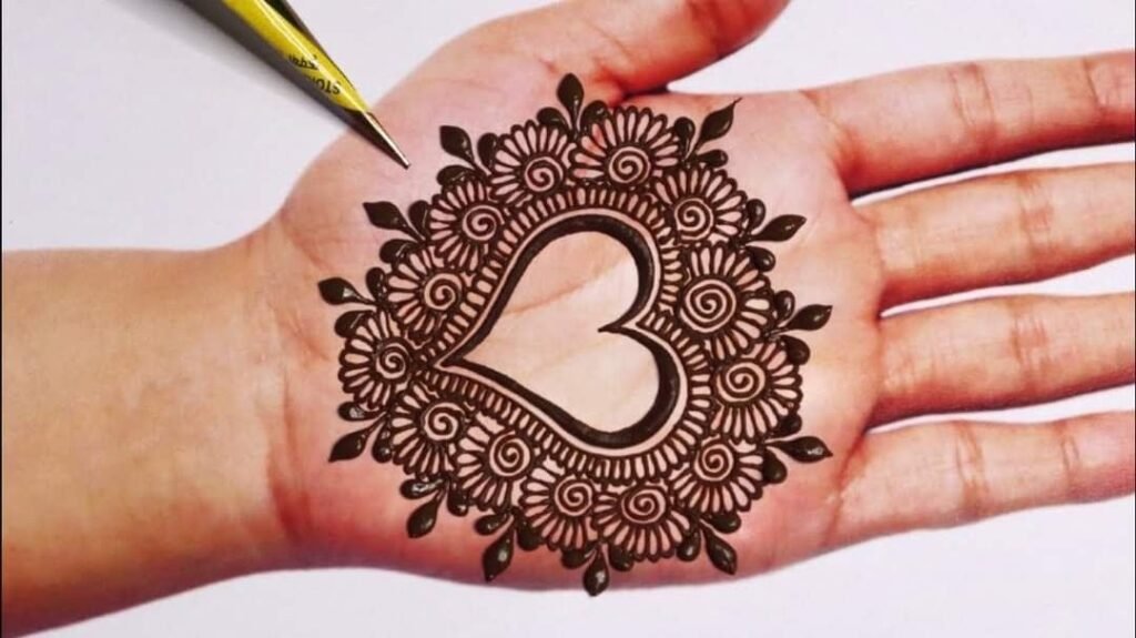 A simple or decorative heart shape placed in the center, surrounded by tiny florals, dots, or mini vines. This is a favorite choice for young girls and aesthetic henna content.