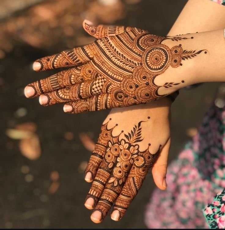 Classic elements like paisleys, peacocks, lotus, and mehndi nets centered on the palm or back. These designs represent cultural roots and look beautiful for festive blogs.