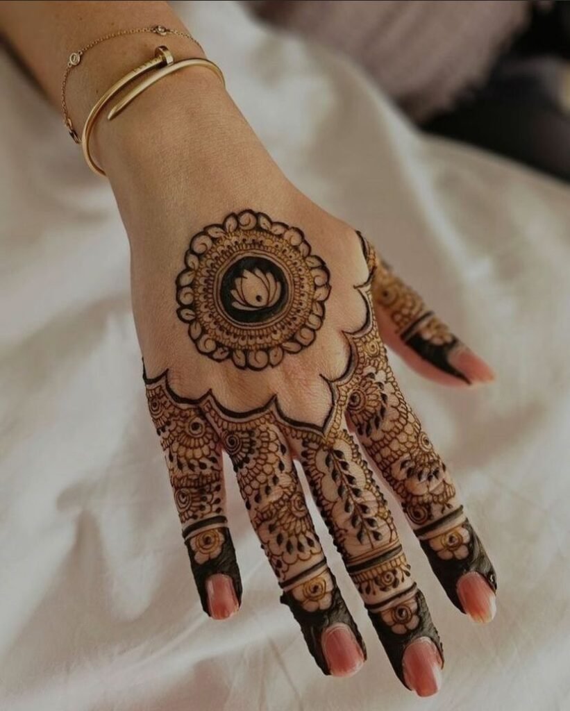 A circular mandala placed exactly in the center, featuring dotwork, petals, fine lines, and layered symmetry. It creates a royal yet soft look without covering the full hand.