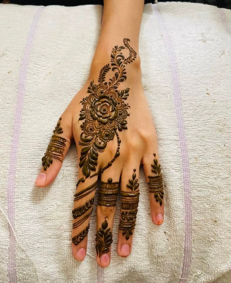 Middle hand mehndi designs focus on the center of the palm, creating a balanced and elegant look. These designs are perfect for those who prefer simplicity with a unique touch. By keeping the design concentrated in the middle, the hand looks neat, modern, and stylish without appearing heavy.