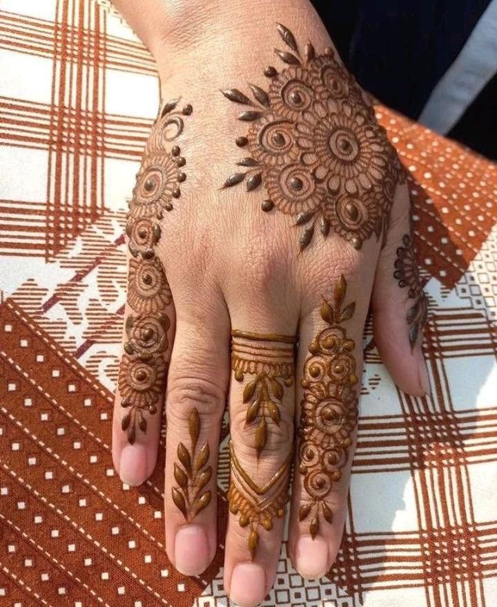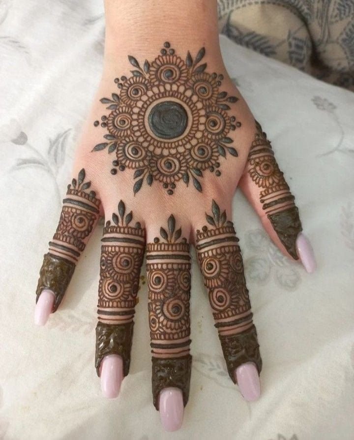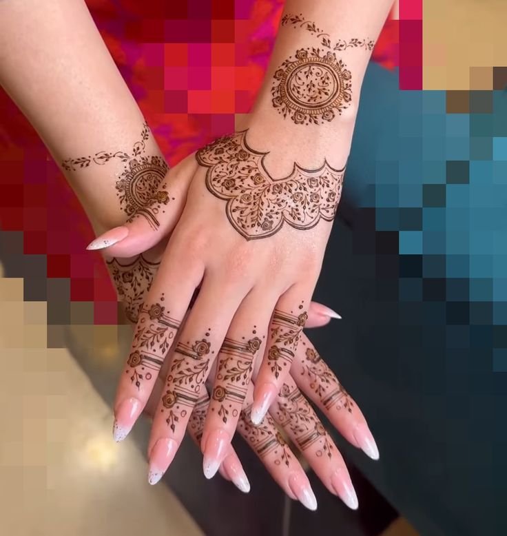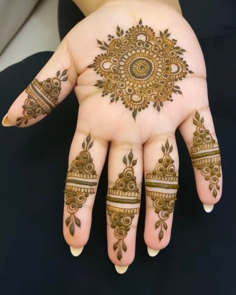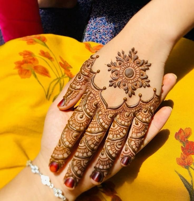 Mandala designs are one of the most popular choices for middle hand mehndi. A round mandala placed in the center of the palm gives a traditional yet modern appearance, especially when paired with minimal finger lines.