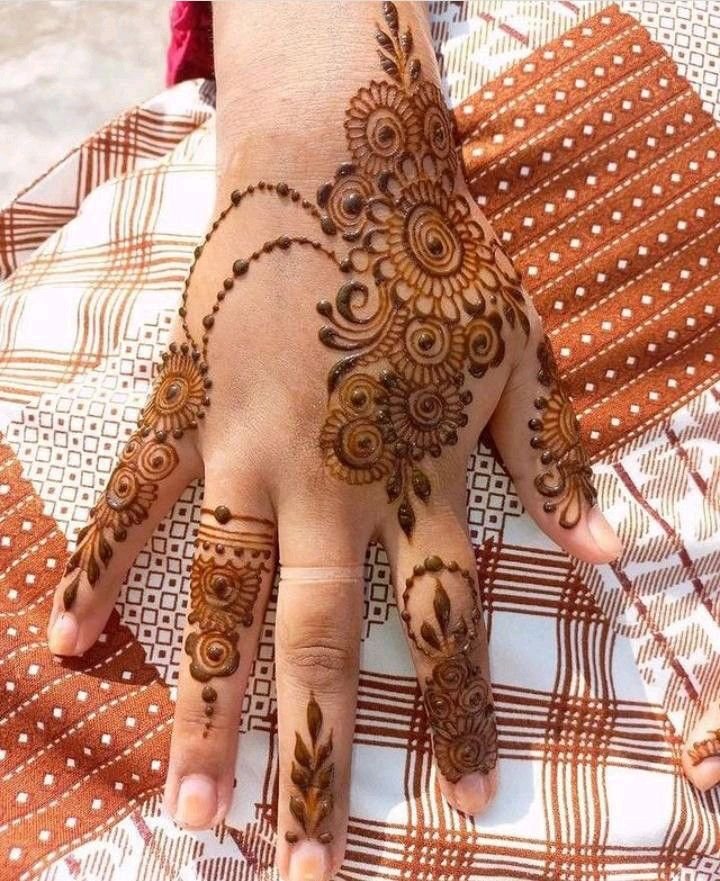 A small floral motif placed in the center of the palm creates a soft and feminine look. Simple petals, leaves, and dots enhance the beauty while keeping the design light and elegant.