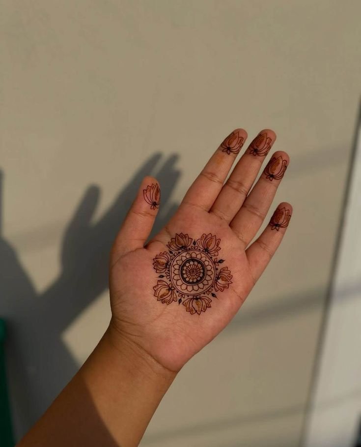 A single mandala on the palm with light detailing on fingers creates a stunning yet simple design.