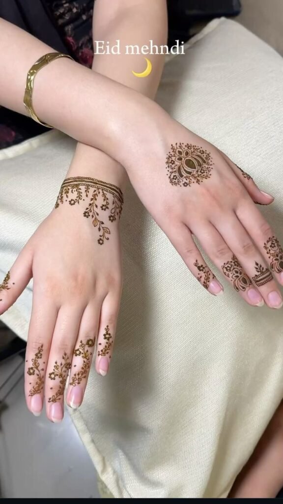 Young girls often prefer light mehndi that feels trendy yet graceful. Minimalist designs with single flowers, leafy trails, or finger-only accents are easy to apply and look fresh. These designs work perfectly for school events, Eid, or family gatherings.