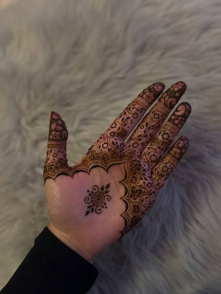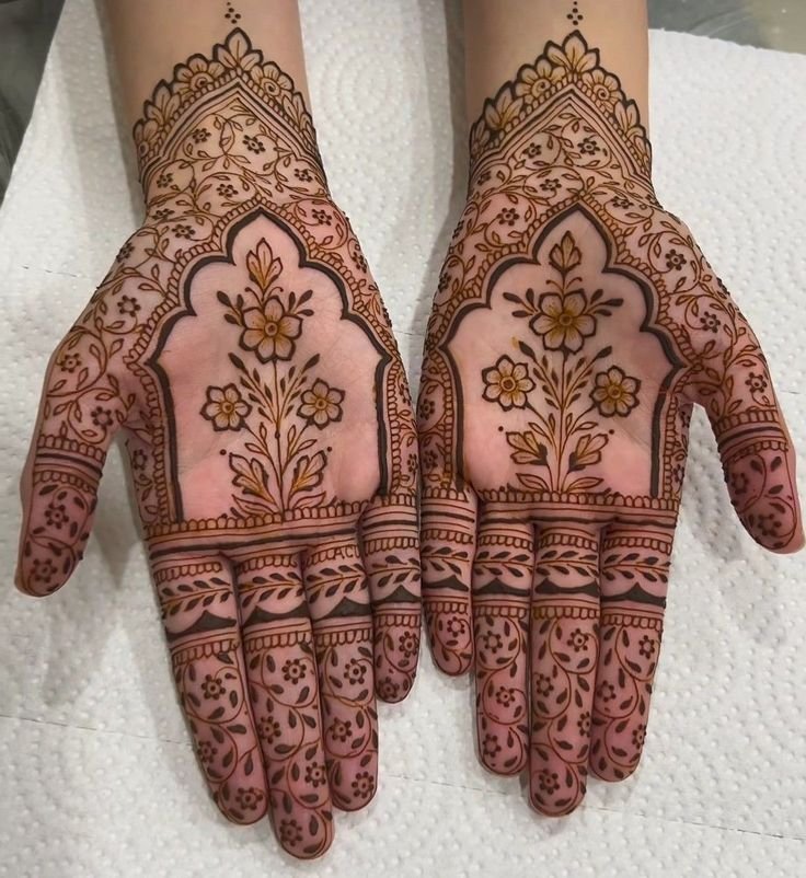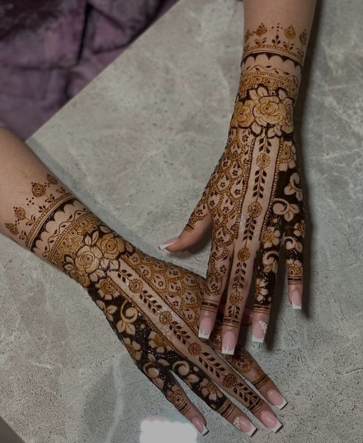 Floral modern full hand mehndi design is a timeless choice that looks graceful for any occasion. These designs usually feature roses, lotus patterns, and leaf trails that beautifully cover the hands. Floral mehndi suits every skin tone and can be customized by combining Arabic and Indian styles. It’s one of the most versatile options for creating a modern and elegant full hand look.