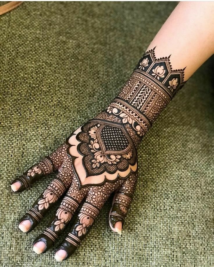Back side modern full hand mehndi design usually features symmetrical and detailed patterns that cover the entire back of the hand. The design typically starts from the fingers and extends toward the wrist or forearm, using floral or geometric shapes. This style is popular for photography and festive events because it highlights the beauty of the hands from every angle.