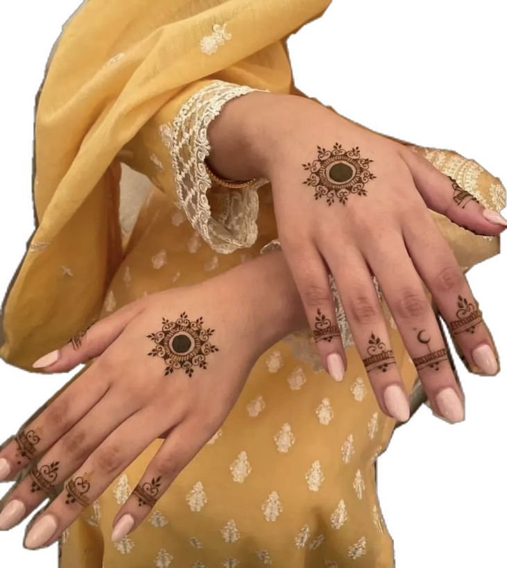 A small mandala placed on the ring finger looks both traditional and chic.