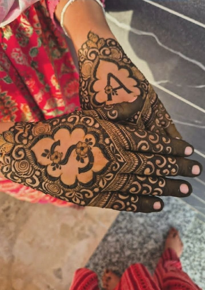 Initials or names integrated into small floral frames or mandala outlines, making the henna meaningful and trendy.